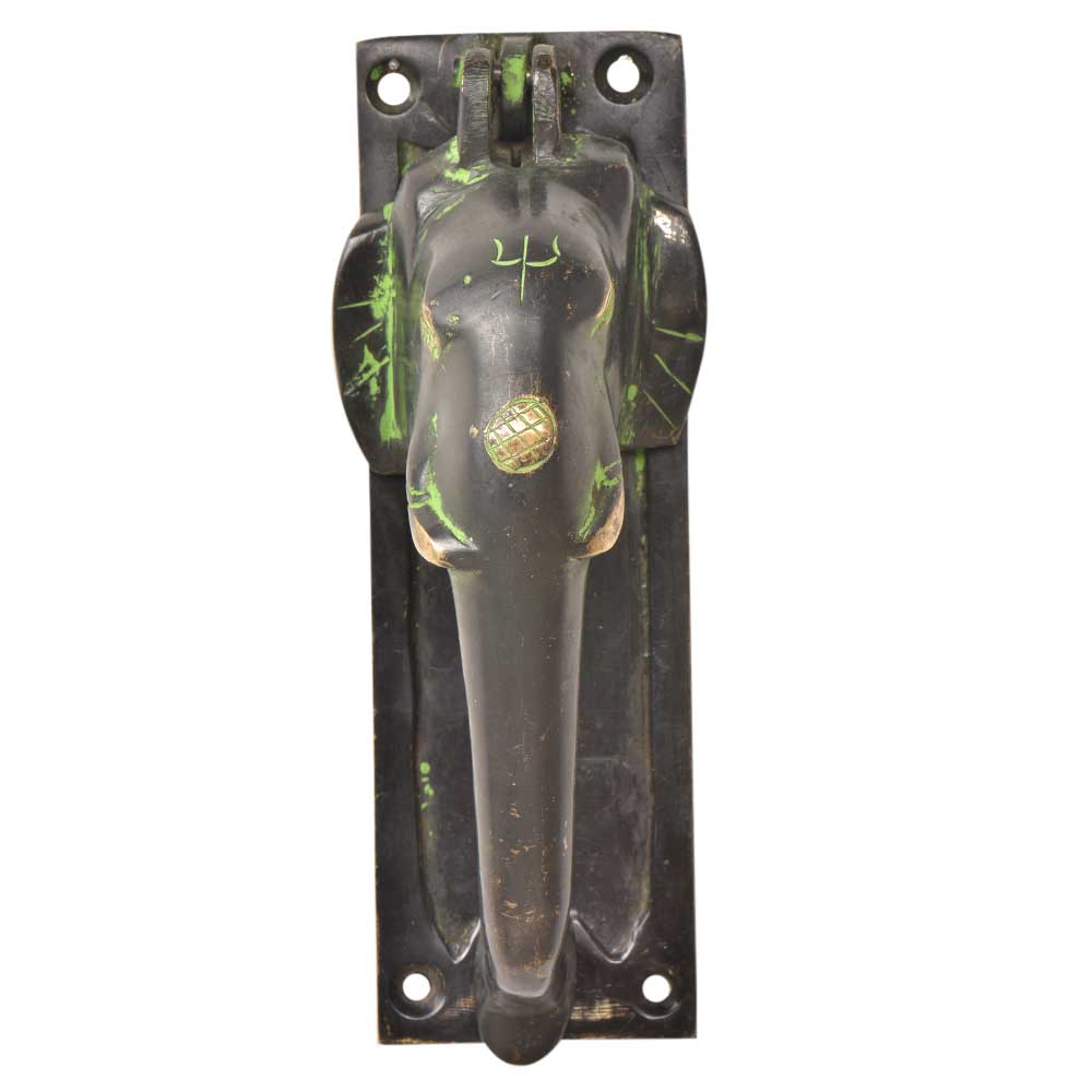 Handmade brass elephant face door knocker with a long trunk that acts as a knocker with brass plate beneath is used to produce the knock sound and also used to fix it on to the door .It add a character to ordinary looking main doo. Also used as a gifting option for family and friends.
