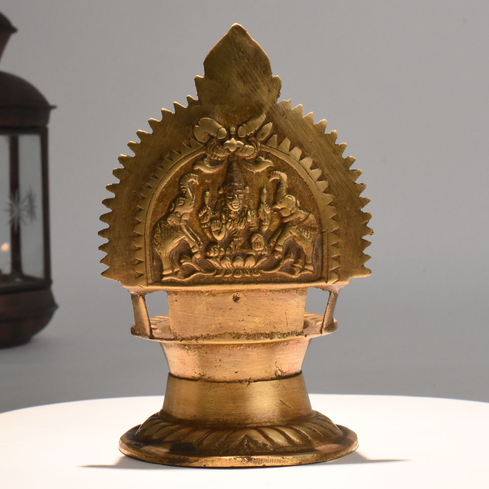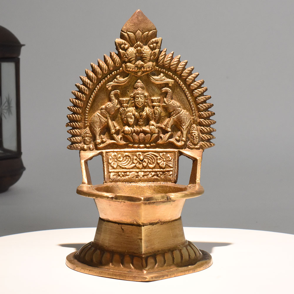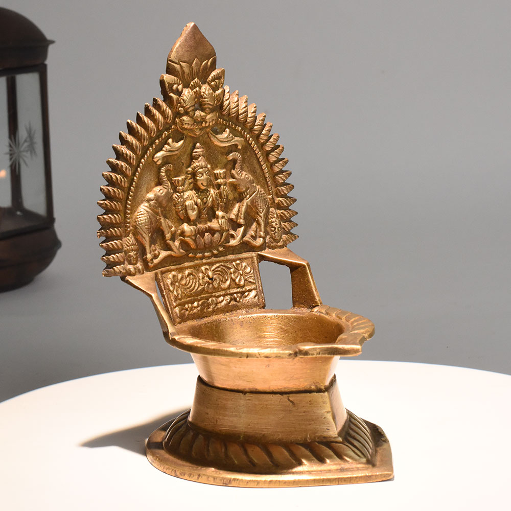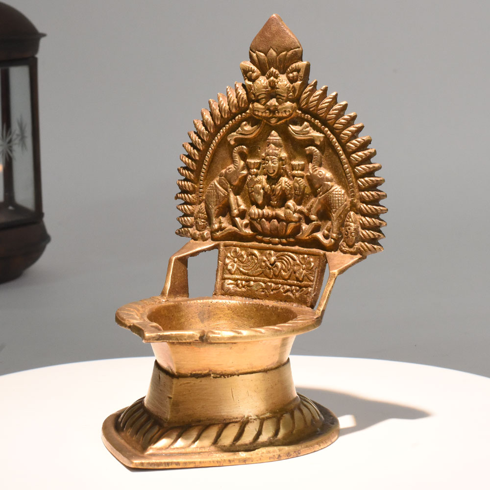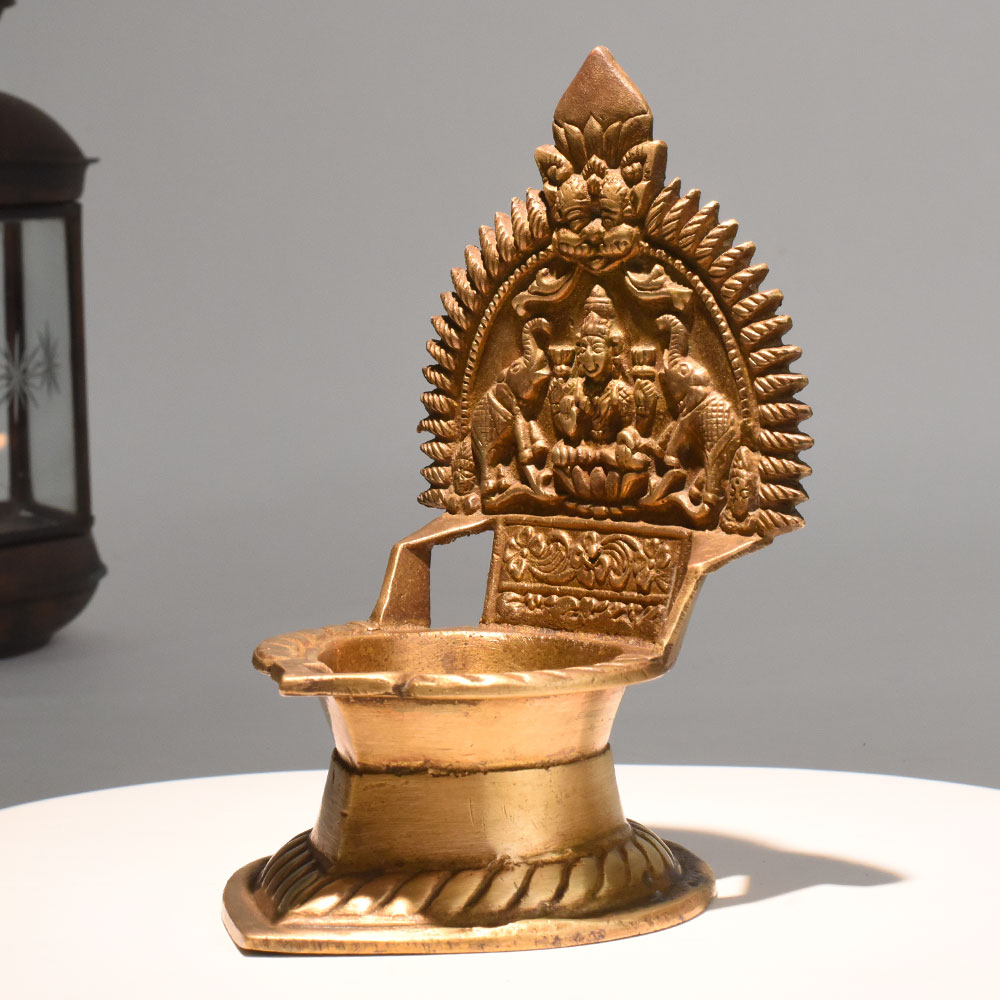 - Handmade brass oil lamp with Lakshmi and elephants