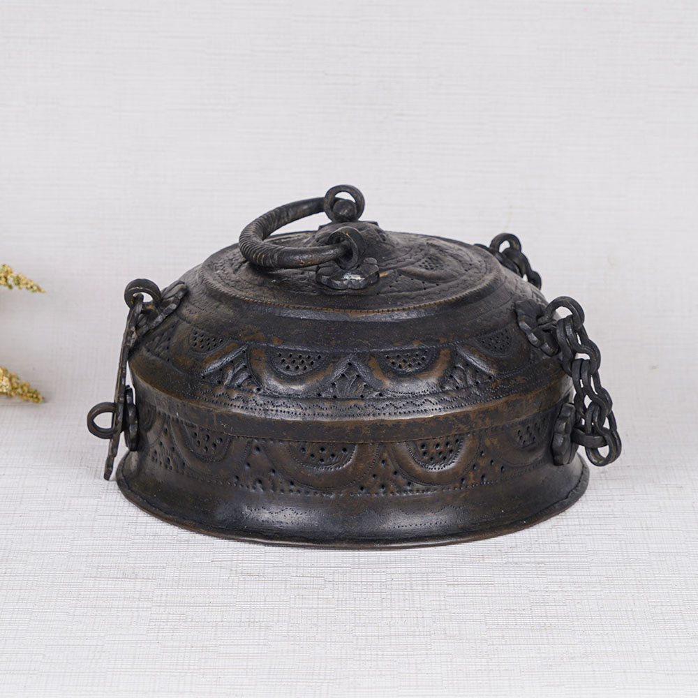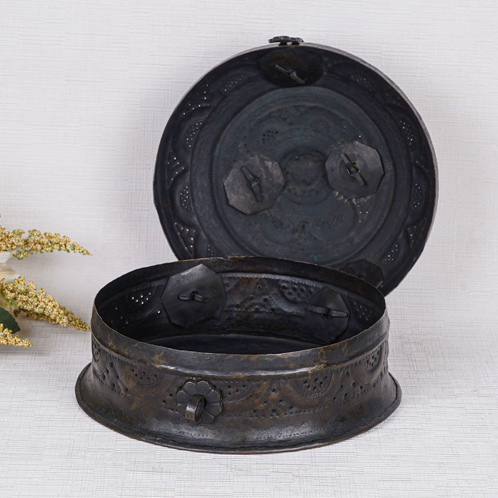 Buy a handmade Jewelry Box online and get a hassle free delivery at your doorstep. This designer jewelry box features a stunning black finish, imparting a timeless vintage look that adds an aura of elegance to any setting. The surface is adorned with beautifully engraved patterns, showcasing the craftsmanship and attention to detail. Equipped with a convenient handle on the top for easy portability and a secure latch to keep your precious items safe, it was originally intended for storing jewelry at home. However, its versatile nature allows it to be utilized as a small jewelry gift box or a luxurious storage solution for cherished belongings. Beyond practicality, this ornate piece can serve as a captivating decor element, enhancing the ambiance of your home, office, restaurant, or hotel. Its alluring charm also makes it an ideal exhibit in museums or exhibitions, capturing the attention of admirers. Gift this exquisite brass jewelry box to your loved ones on special or festive occasions, and witness their delight as they unwrap a treasure that radiates both beauty and craftsmanship.
