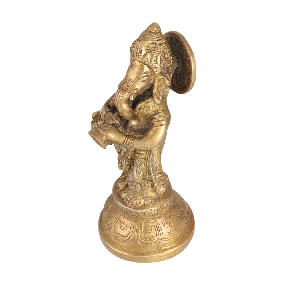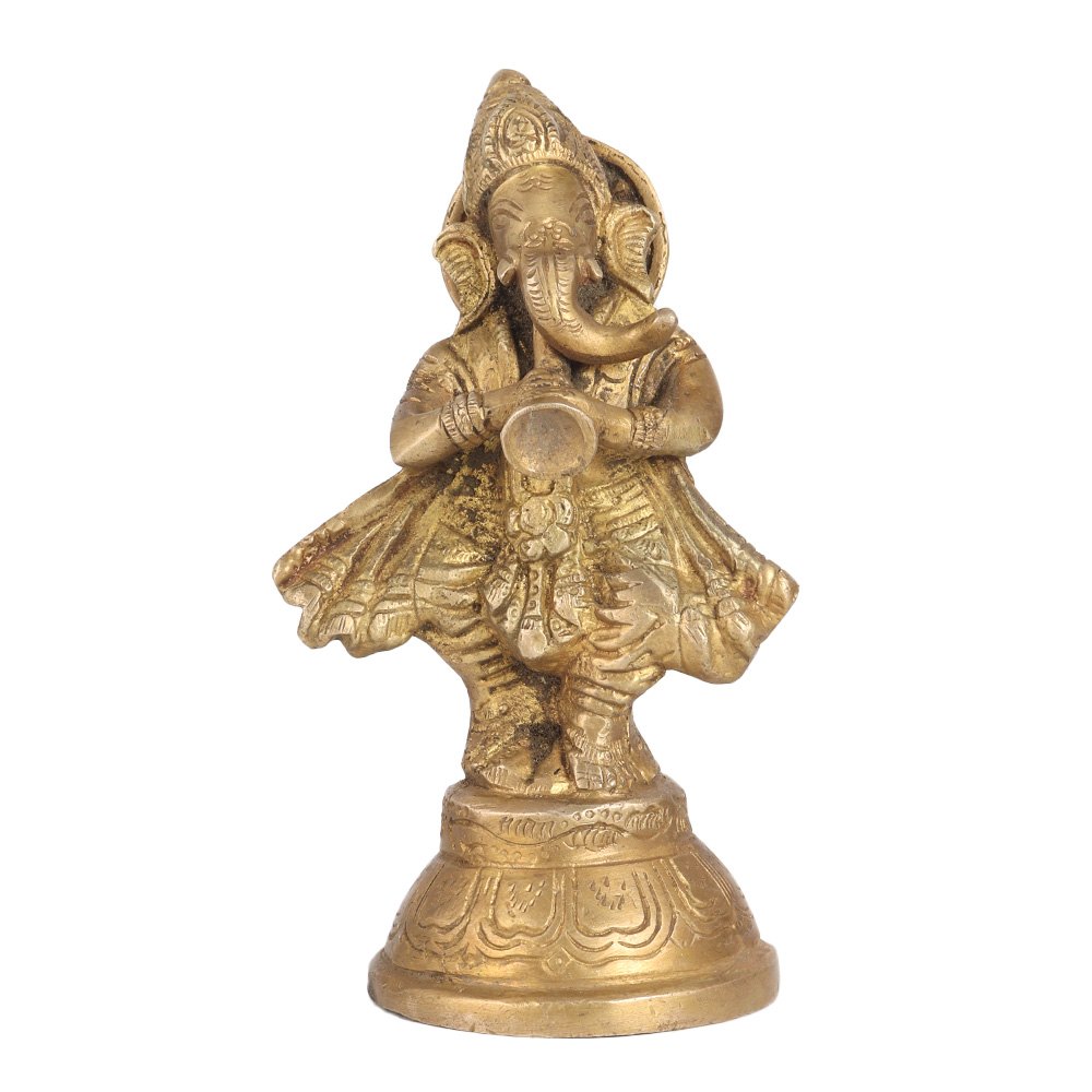 Buy a brass statue of Lord Ganesha that is a beautiful representation of the revered Hindu God, known for his wisdom, intellect, and love for music. In this statue, Lord Ganesha is depicted playing the trumpet, an instrument widely used in Indian classical music. The statue's golden finish enhances its beauty and radiates a sense of positivity and warmth. It is perfect for placing in prayer rooms at home, office, restaurant, hotel, or gym, creating a serene and calming environment. Lord Ganesha is believed to be the remover of obstacles and the lord of new beginnings, and is worshipped by millions of Hindus worldwide. The statue's intricate details and expert craftsmanship make it an exquisite and valuable piece of art, inspiring all who see it. You can gift this auspicious item to your loved ones on special or festive occasions.