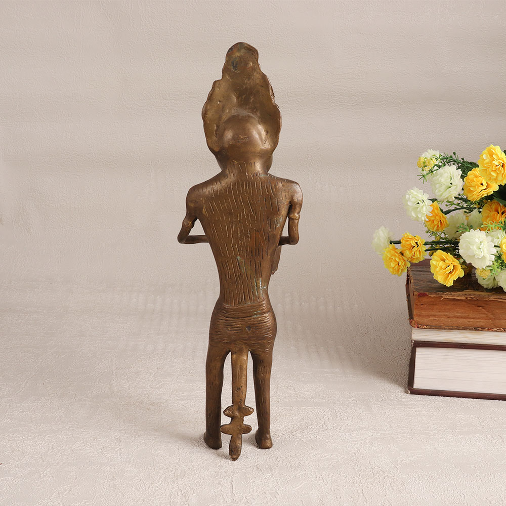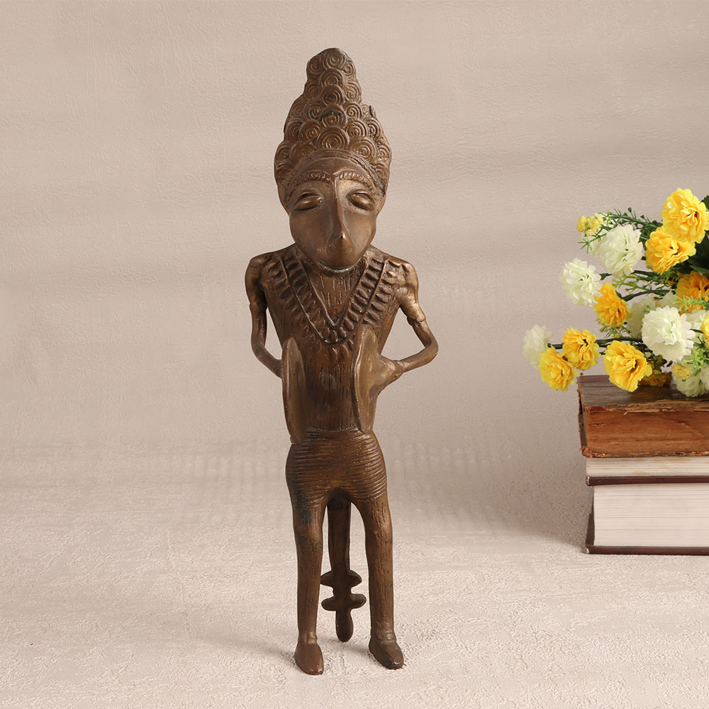 Adorn your interior with the timeless allure of this exquisite brass statue that is a masterfully crafted male figure standing proudly, captivatingly playing the cymbal. Handcrafted by highly talented Indian artisans in the heart of Folk Himalayan Art, this piece is a testament to their artistry and devotion to preserving heritage. The statue boasts a rich antique brown finish, giving it an air of old-world charm, and is meticulously cast from high-quality brass, ensuring its durability and a lustrous sheen that will stand the test of time. With its versatile size and elegant design, this remarkable creation can be a captivating addition to your home, office, hotel, cafe, shop, or restaurant. Its presence evokes a sense of cultural richness and artistic appreciation. A fusion of artistic excellence and historical significance, this statue is a must-have for collectors. Display it at exhibitions, allowing the intricacies of Indian craftsmanship to shine. Moreover, this statue makes for an exceptional gift on special, festive, or auspicious occasions, sharing the beauty of tradition with your family, friends or relatives.