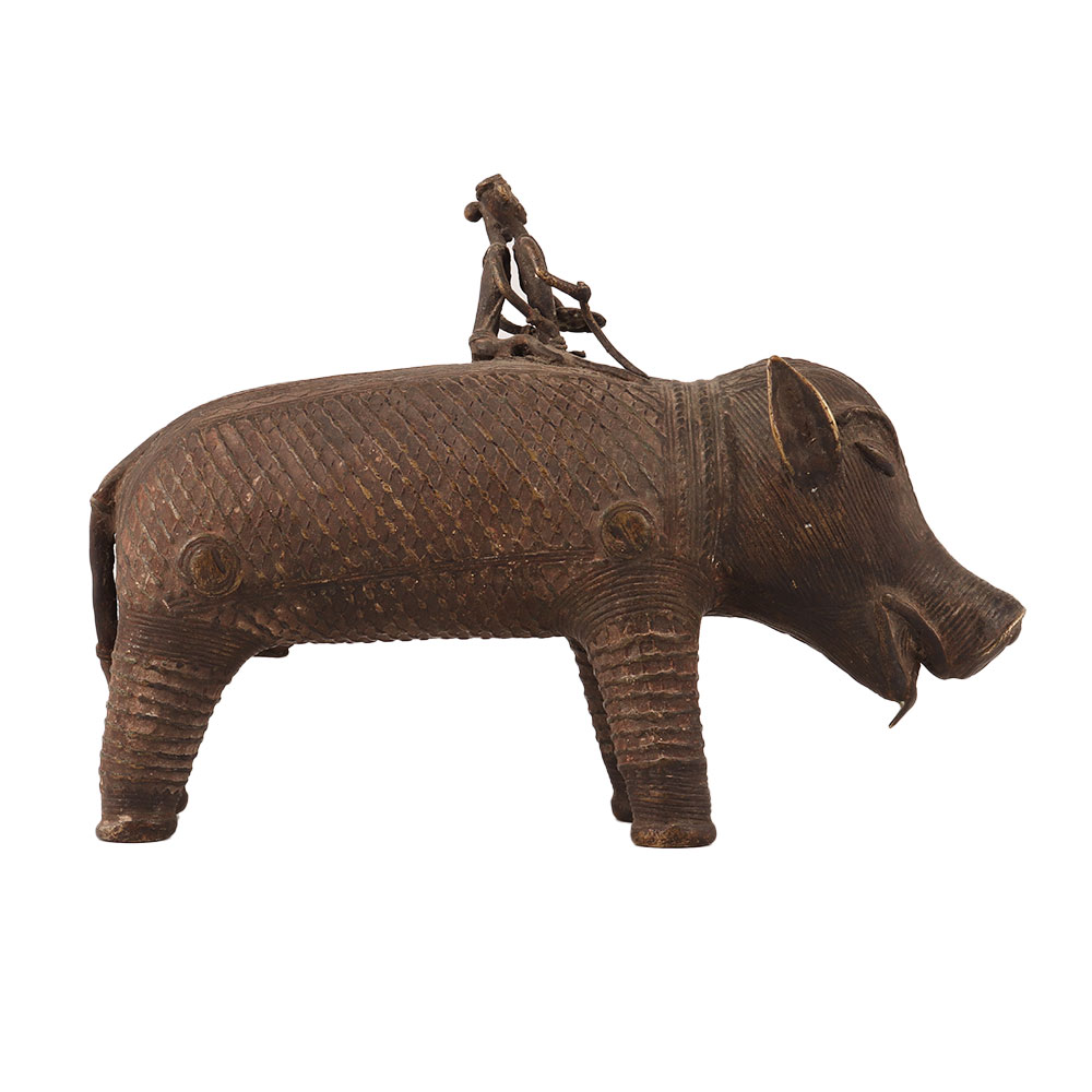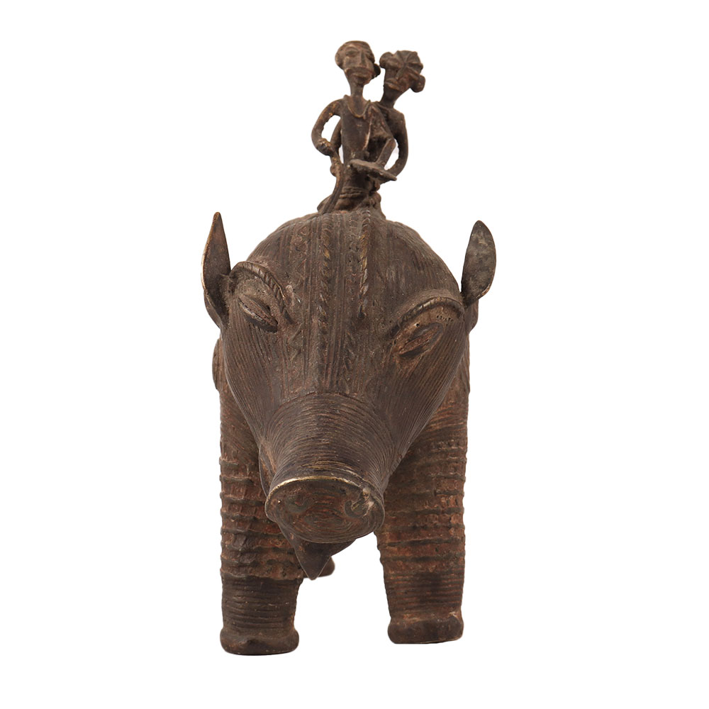This brass statue of a pig with two riders in tribal art is a stunning work of art made by skilled Indian artisans from Nagaland. The intricate details and stunning craftsmanship that went into creating this piece are truly impressive. The tribal art style of the statue gives it a unique and distinctive look that is sure to impress any collector of decorative items. The pig with two riders adds a touch of whimsy to the piece, making it a great addition to any space. Its timeless beauty and unique style make it a must-have for any lover of tribal art, and it would make a great addition to any collection or exhibition. A perfect gift to your family, friends or relatives on special or festive occasions.