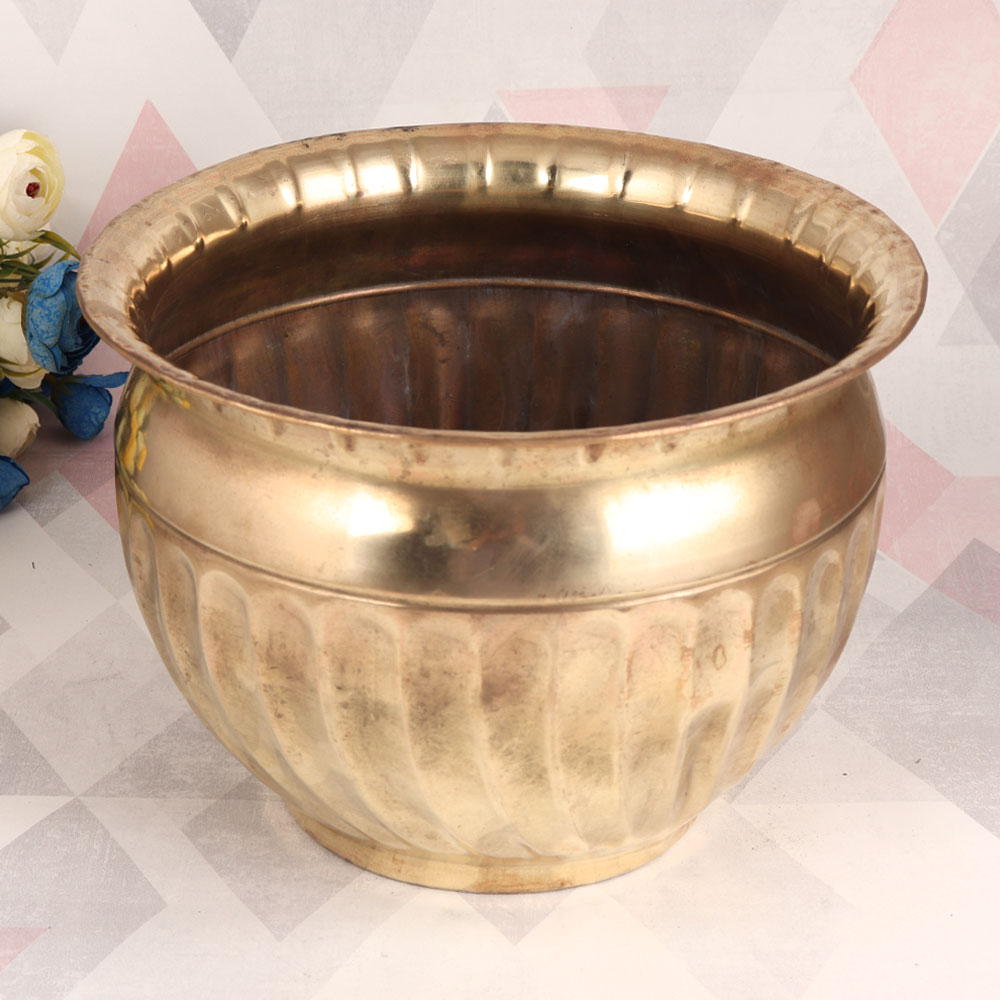 Adorn your interiors with this Vintage Brass Planter that is meticulously handcrafted by highly talented Indian artisans. Crafted from high-quality brass, this planter boasts a rich antique brown finish, creating a stunning contrast against the intricate line pattern that adorns its surface. Versatility defines this timeless piece, making it a perfect addition to any setting. Whether gracing your home, office, restaurant, hotel, or cafe, this planter adds a touch of classic elegance. Use it as a flower pot, breathing life into your surroundings with vibrant blooms, or simply let its artistic allure shine as a standalone statement piece. Its vintage charm ensures it's right at home among antique treasures, and it's equally at ease in a museum or exhibition, commanding attention as a work of art in its own right. When you're looking for that special gift, this Vintage Brass Planter fits the bill perfectly. Celebrate special, festive, or auspicious occasions by gifting it to your family, friends or relatives, sharing a piece of India's rich artisanal heritage, and adding a touch of timeless beauty to their lives.