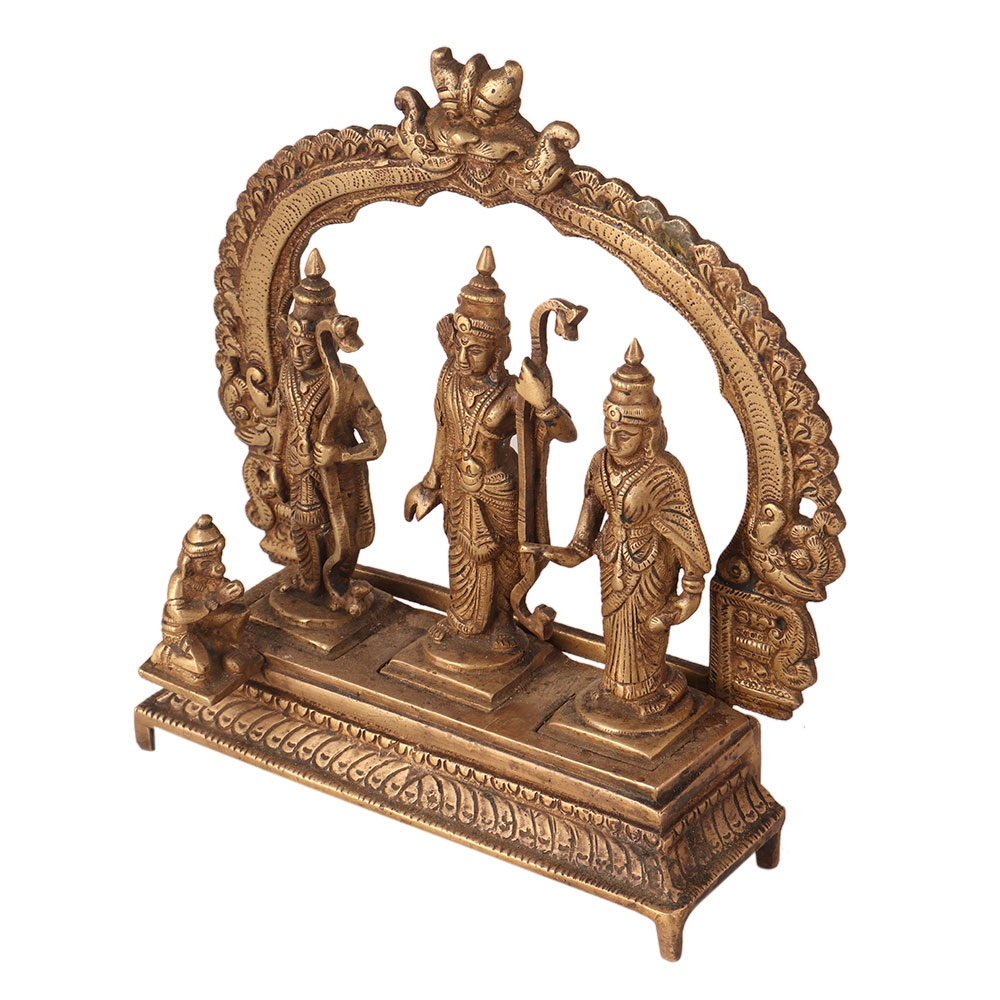A heavy brass Ram Darbar with Hanuman greeting Lord Ram on his knees. It is hand carved by skilled Indian workers with intricate details. It has a stand with four supports to hold on the surface. In this statue, Lord Ram and Lord Laxman hold a bow in their left hand and arrows on their right shoulder. Lord Ram stands in the centre and Lord Laxman stands to the right of Ram. Goddess Sita is standing to the left of Lord Ram holding a lotus in her left hand. Hanuman is seen sitting on his knees and greeting Lord Ram. Hanuman is an ardent devotee of Lord Ram. An ideal gift on the occasion of Deepavali, New Year, wedding or birthday.