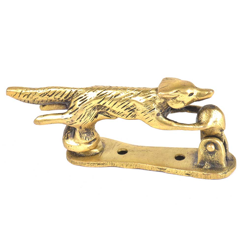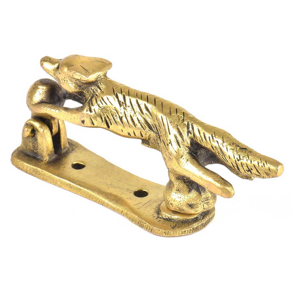 Exclusively handmade solid and heavy door knocker for use on front doors, porches and home entrances is i the shape of a wild roig fox that comes along with a plate.