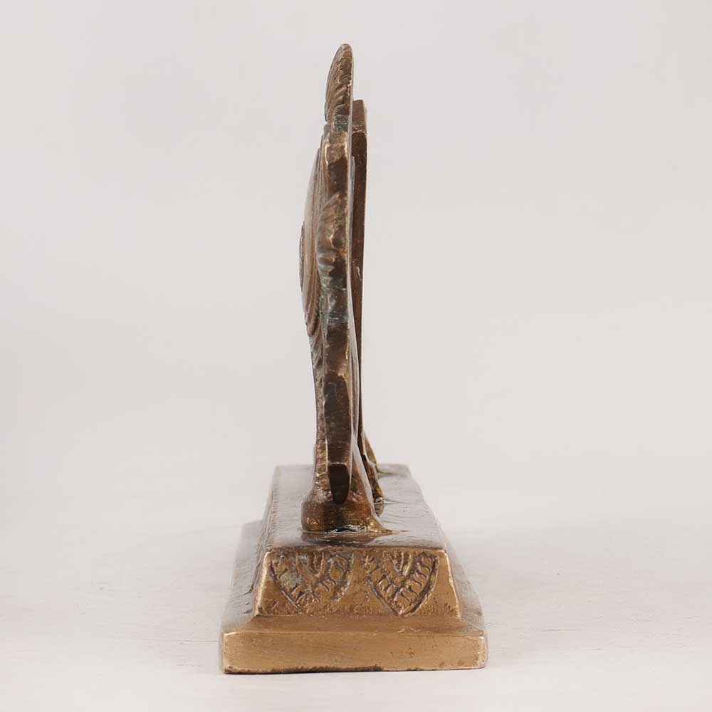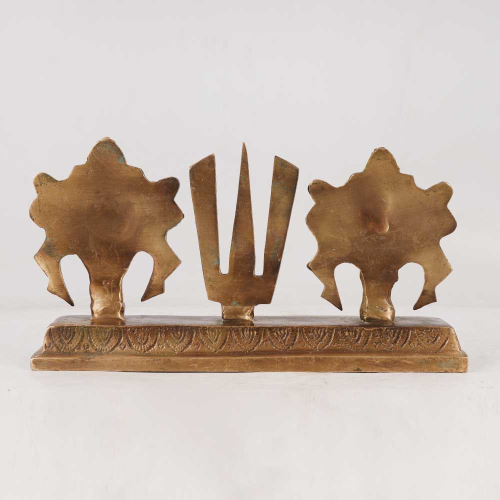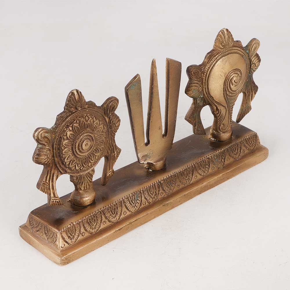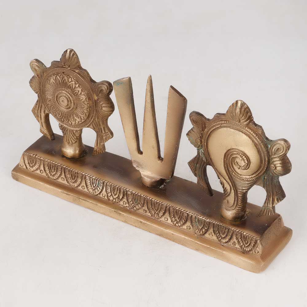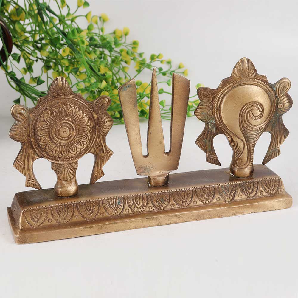 Buy a Brass Shankh Chakra Namah online that is a true testament to craftsmanship and artistry. This beautiful piece is handcrafted by highly skilled and experienced Indian artisans using finest-quality brass, ensuring its durability and timeless appeal. Its antique golden finish exudes an air of elegance and sophistication, making it a perfect addition to any decor style. This Shankh Chakra Namah holds deep cultural significance as it symbolizes prosperity, spirituality, and divine blessings. Its unique design features intricate detailing, capturing the essence of Indian traditions and spirituality, making it a conversation starter and an eye-catching display for any home, office, restaurant, hotel, or cafe. Versatility is another hallmark of this masterpiece. Whether you want to enhance the ambiance of your living space or create an alluring display at exhibitions or vintage collections, the Brass Shankh Chakra Namah serves as a captivating centerpiece. Furthermore, this extraordinary piece makes an ideal gift for your loved ones on special or festive occasions. Its inherent cultural value and impeccable craftsmanship will surely be cherished and appreciated by those who receive it. Immerse yourself in the richness of Indian culture and spirituality with the Brass Shankh Chakra Namah, a timeless masterpiece that will add grace and charm to any setting.