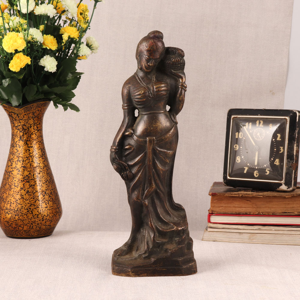 Buy a captivating statue that features a lady standing gracefully, holding a pot in her left hand. The statue is made with exquisite attention to detail and finished in a dark hue, creating a stunning visual impact. It is an ideal choice for decorating any space, including homes, offices, restaurants, hotels, cafes, and shops, and is perfect for collectors. The statue showcases the beauty and elegance of a lady, with intricate detailing capturing every curve and feature. It can also be an excellent addition to a collection, making it a valuable and treasured item. Whether for decoration or collection, this statue is a beautiful work of art that can be appreciated and admired by all. You can gift this statue to your loved ones on special and festive occasions.