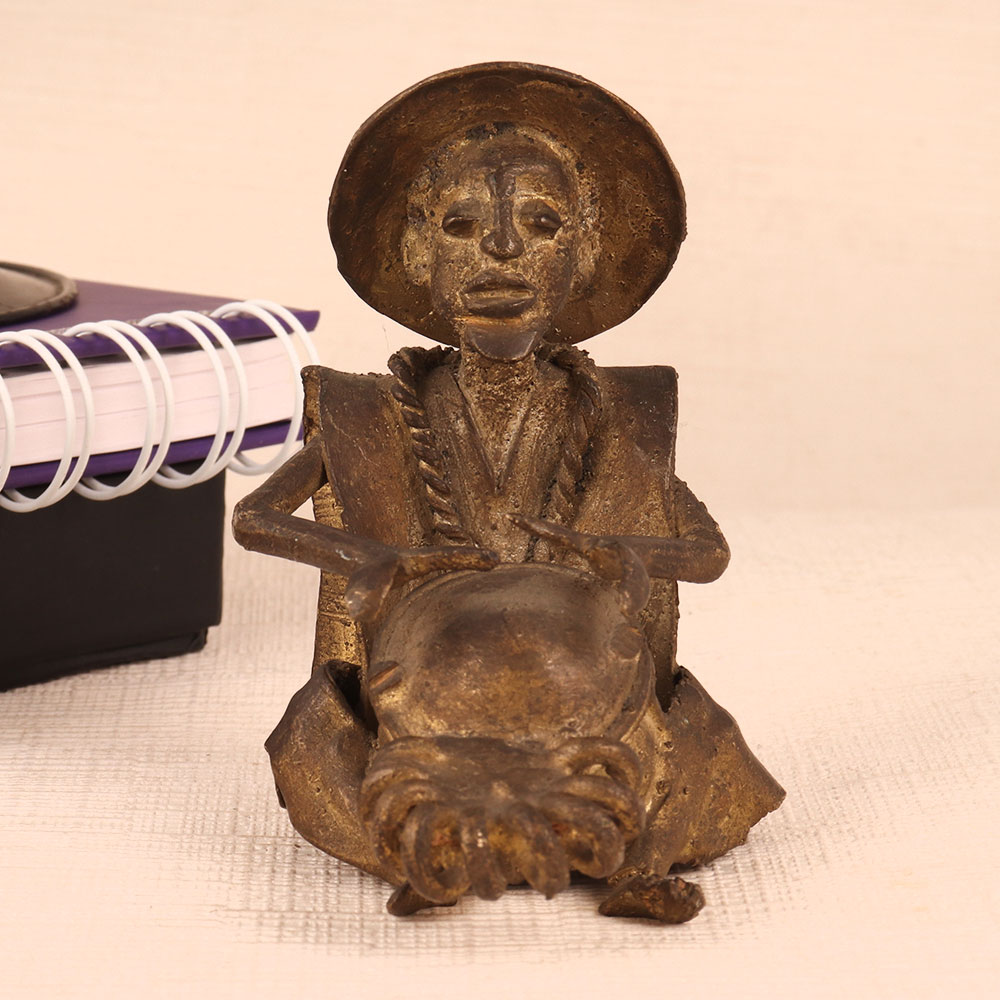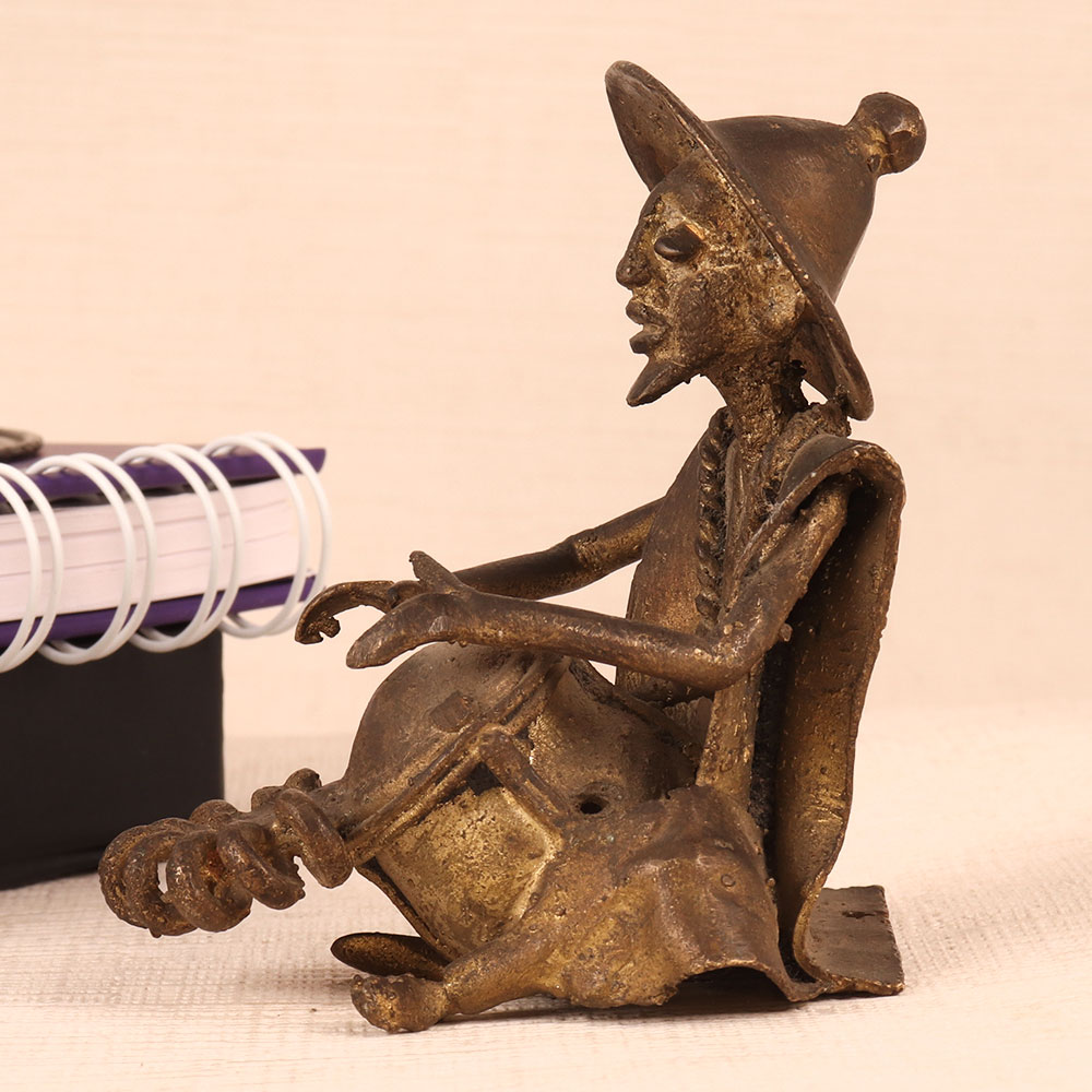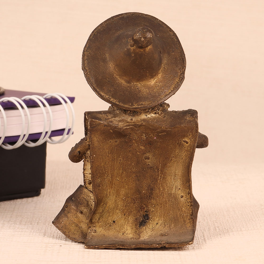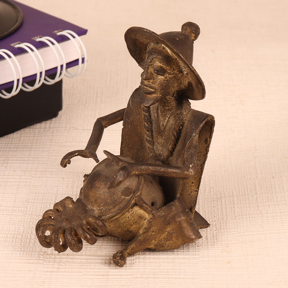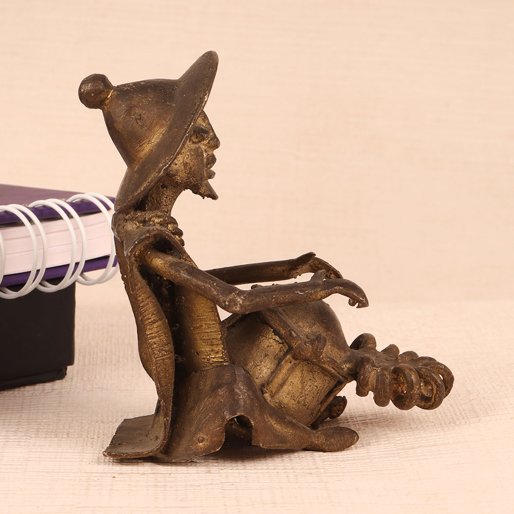 Adorn your interior decor with this exquisite Vintage Brass Statue, a testament to Indian craftsmanship and heritage. Handmade by talented craftsmen in India, this captivating piece features a male figure sitting gracefully, passionately engrossed in playing a drum. The antique brown finish adds a touch of timeless elegance to this already stunning creation, making it the perfect addition to any space. Whether you wish to adorn your home, office, restaurant, hotel, cafe, or shop, this statue will infuse an air of sophistication and culture into your surroundings. Collectors with an appreciation for vintage treasures will find this statue a prized addition to their repertoire. Its intricate details and warm patina make it a true collector's gem. Furthermore, this statue makes for an ideal gift on special, festive, or auspicious occasions. Surprise your family, friends or relatives with a piece of Indian artistry that exudes charm and history, a thoughtful gesture that will be cherished for years to come.