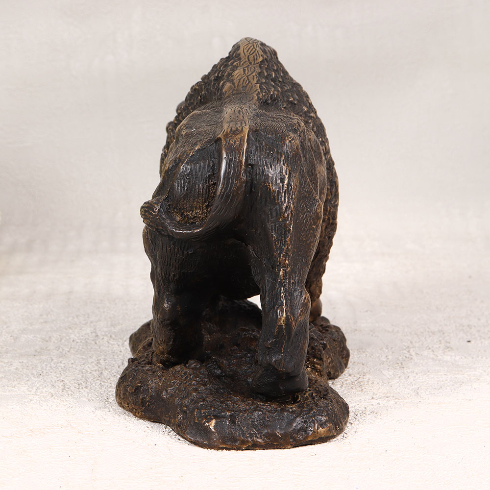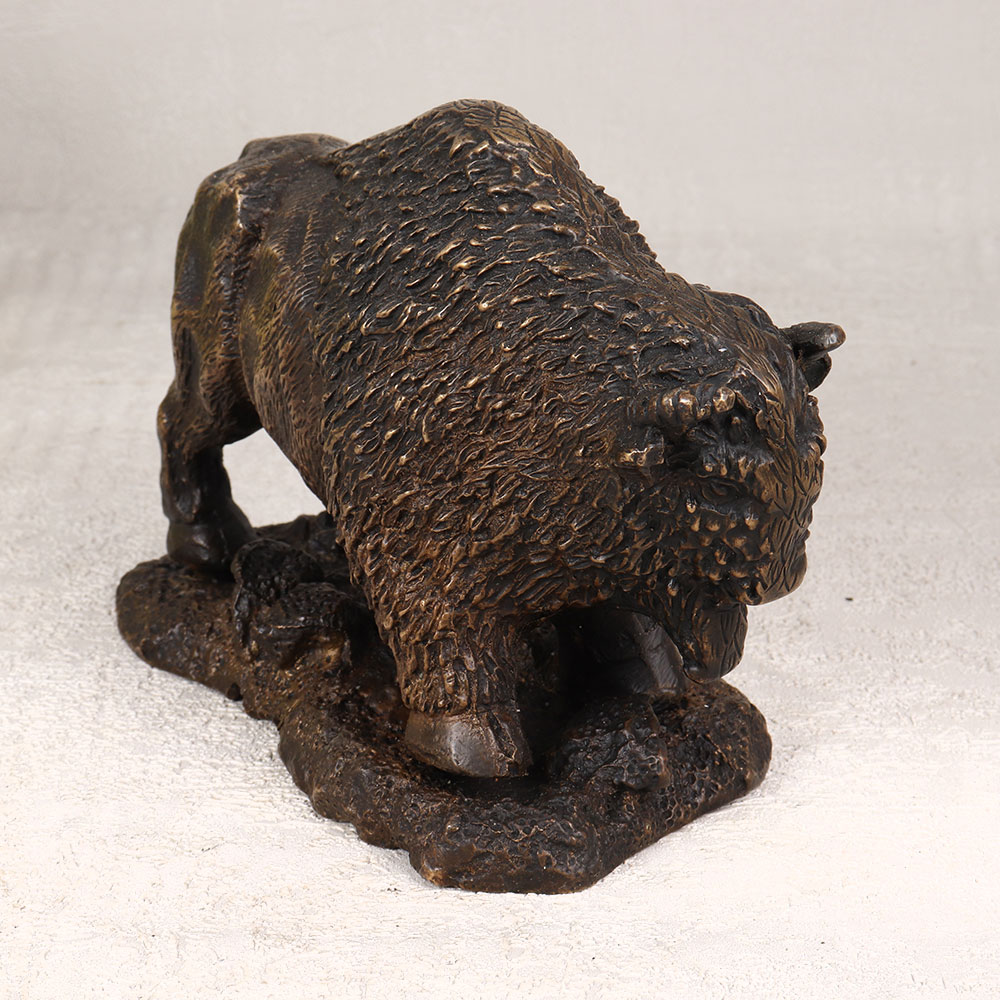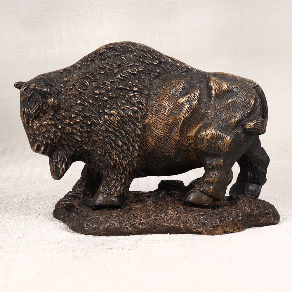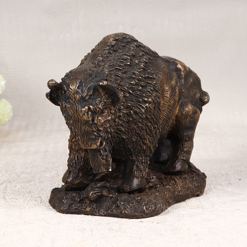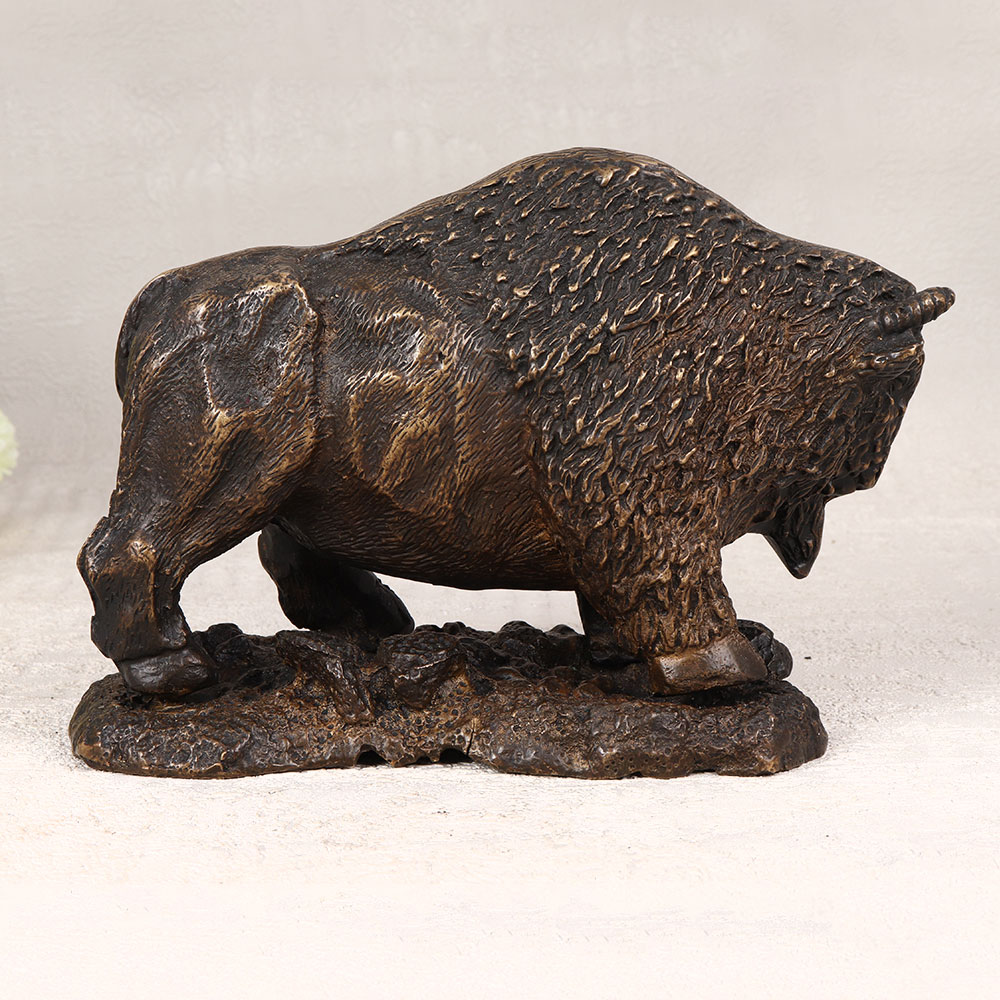 A Brass Statue of the North American Bison Buffalo which is a symbol of strength and resilience. Standing proudly on a sturdy platform, this piece showcases intricate details, expertly crafted by highly skilled artisans in the English Art tradition. The antique brown finish adds a touch of vintage charm, enhancing the allure of this handcrafted sculpture. Meticulously cast from high-quality brass, the Bison Buffalo statue is a testament to craftsmanship and precision. Suitable for a variety of spaces, including homes, offices, restaurants, hotels, or cafes, it serves as a captivating decorative accent. Elevate your surroundings with a touch of rustic elegance, making a statement that resonates with the spirit of the wild. This timeless piece isn't just a decorative item, it's an addition to a vintage collection, a unique expression of artistry. Perfect for gifting on special, festive, or auspicious occasions, this brass masterpiece is a heartfelt way to convey admiration and appreciation to your family, friends or relatives.