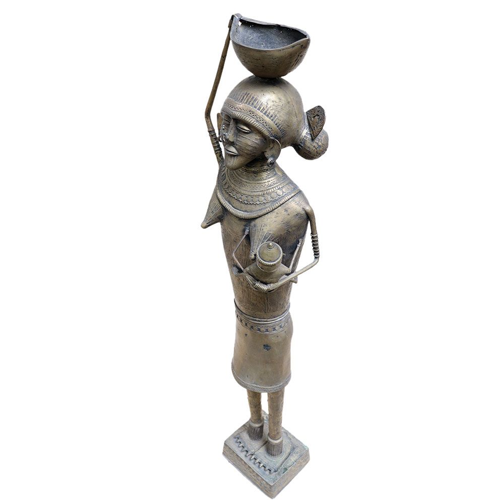 Lovely hand made tribal handcrafted figurine depicts a Kandha Tribal Lady wearing traditional Kandha Tribal attire and nursing her child. The figurine is one-of-a-kind due to its primitive design, tribal style of dress, and the emotions associated with the mother-child connection.