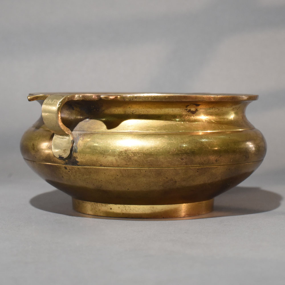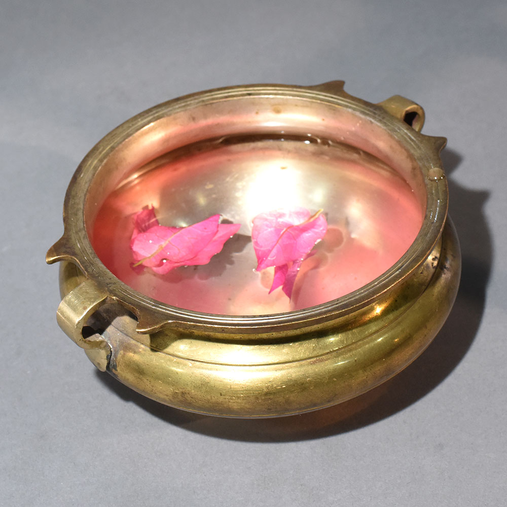 Crafted in the traditional Himalayan style, this vintage brass Urli pot brings together simplicity, strength, and decorative elegance. Designed for floral decoration, its wide rim and shallow depth allow water and flowers to settle naturally, creating visually pleasing arrangements. The aged brass finish features natural tonal variations that develop only over time, giving the Urli a warm and earthy appearance. The sturdy side handles enhance both balance and visual appeal, reflecting the practical artistry of Himalayan metalwork. This Urli works beautifully in pooja rooms, entryways, or festive setups. When filled with petals or floating diyas, it becomes a focal point that adds calm and warmth to the surroundings. Even without flowers, the sculptural form stands out as a vintage decor accent. A perfect blend of utility and heritage, this Urli is suited for collectors and decor enthusiasts alike.