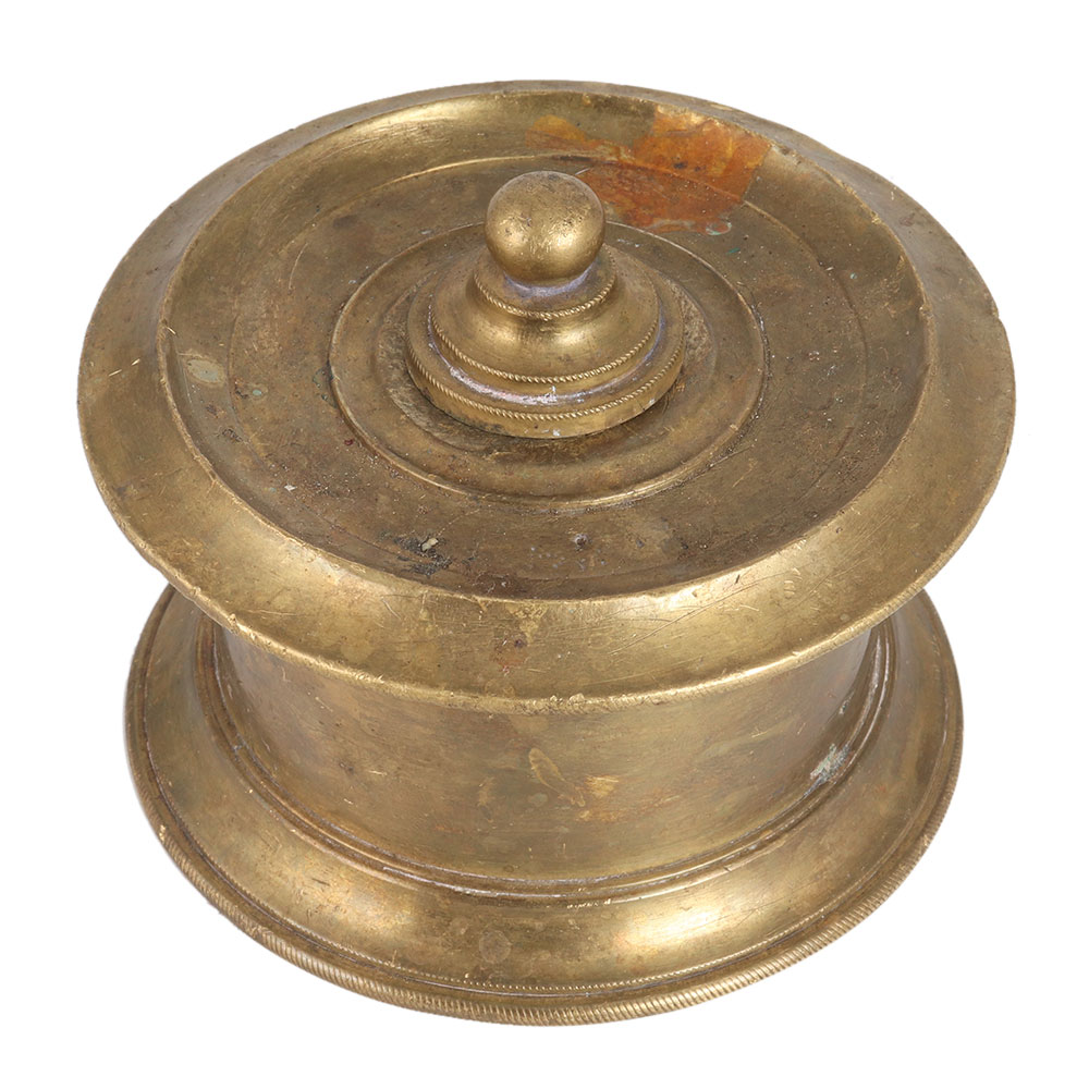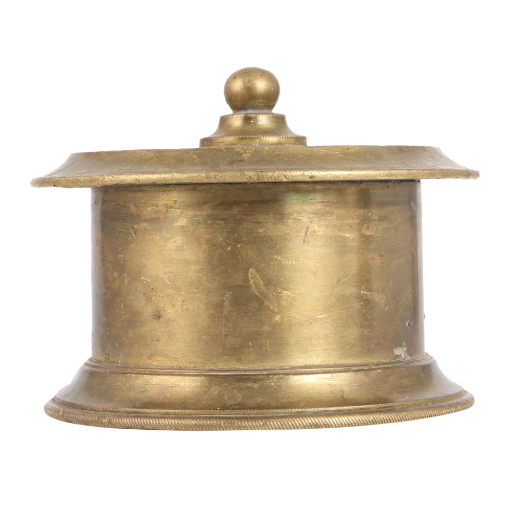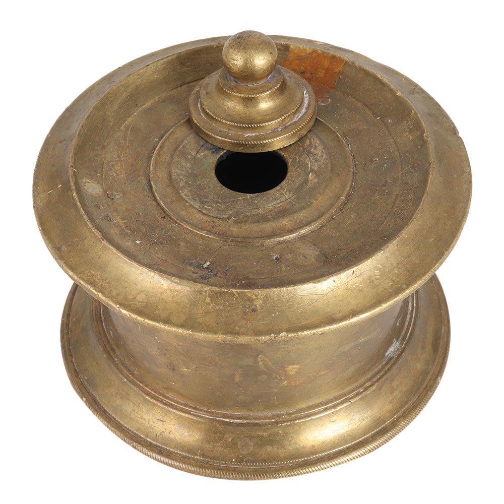 This vintage style ink pot is carved from brass metal alloy. It was handcrafted by skilled artisans in Rajasthan, India. It has been used as an ink pot since ancient times, so it has a lid to put the ink in. It has a matte finish. The ink pot was used by kings and emperors to sign papers with quills dipped in ink. Add this incredible, distinctive item to your collection. Place it on your table or shelf at home, in your office or shop. An absolute gift for special occasions for your loved ones.