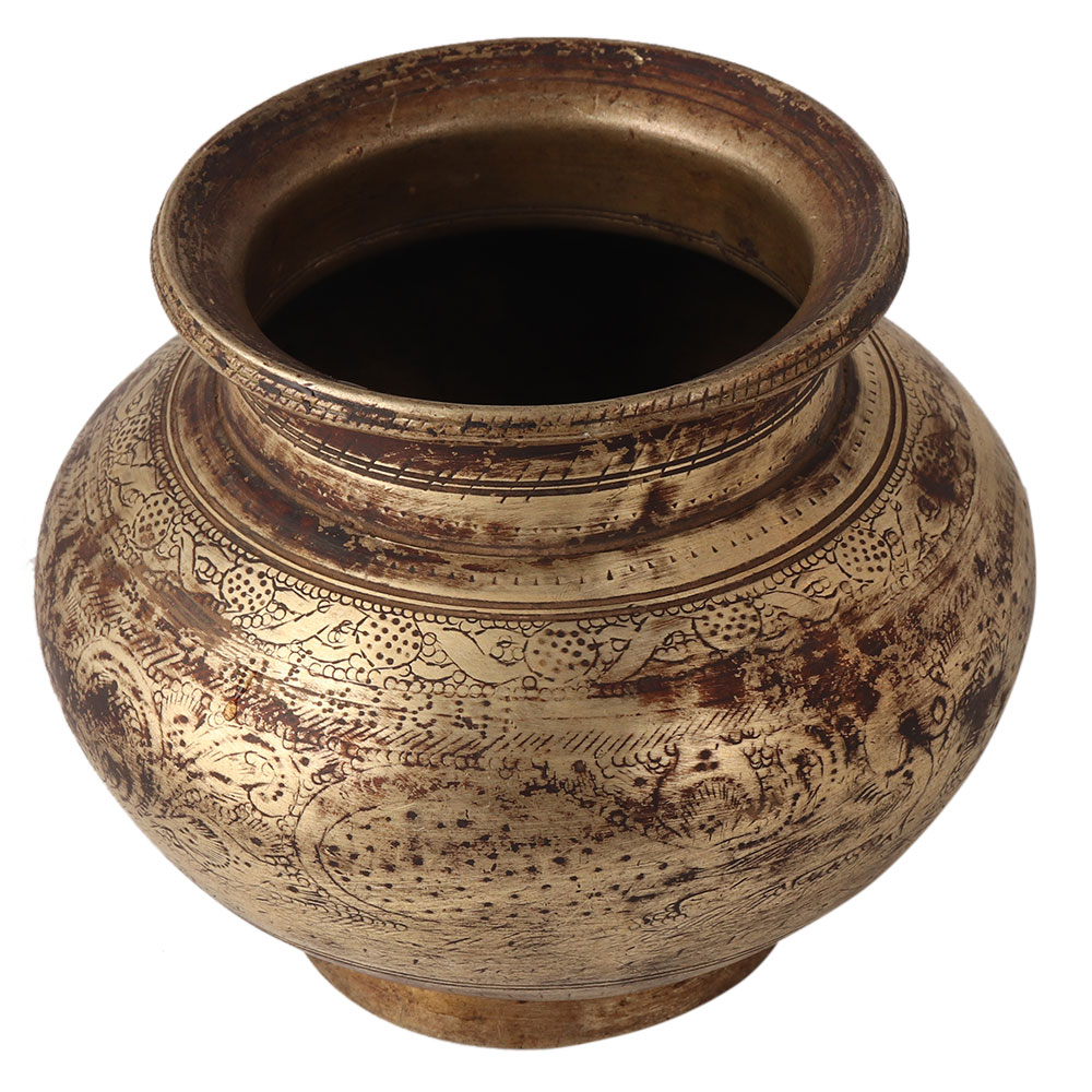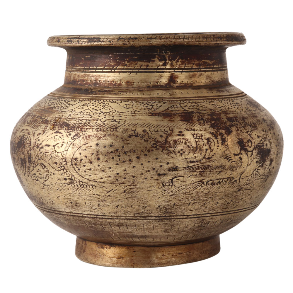 This brass water pot is engraved with alluring peacocks and patterns. It has a vintage look. It is handmade by local Indian artists with Gujarat art, which gives it a sturdy look. It can be used to decorate home, office, stage or spiritual events.