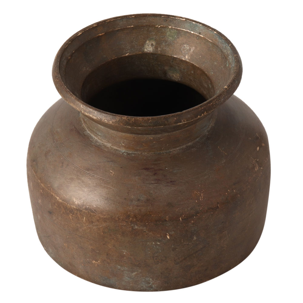 Handmade brass pot made in India by rural artisans. Brass pots are used in Hindu worship for sun puja. The brass pots are filled with holy water, flowers and other cult objects.