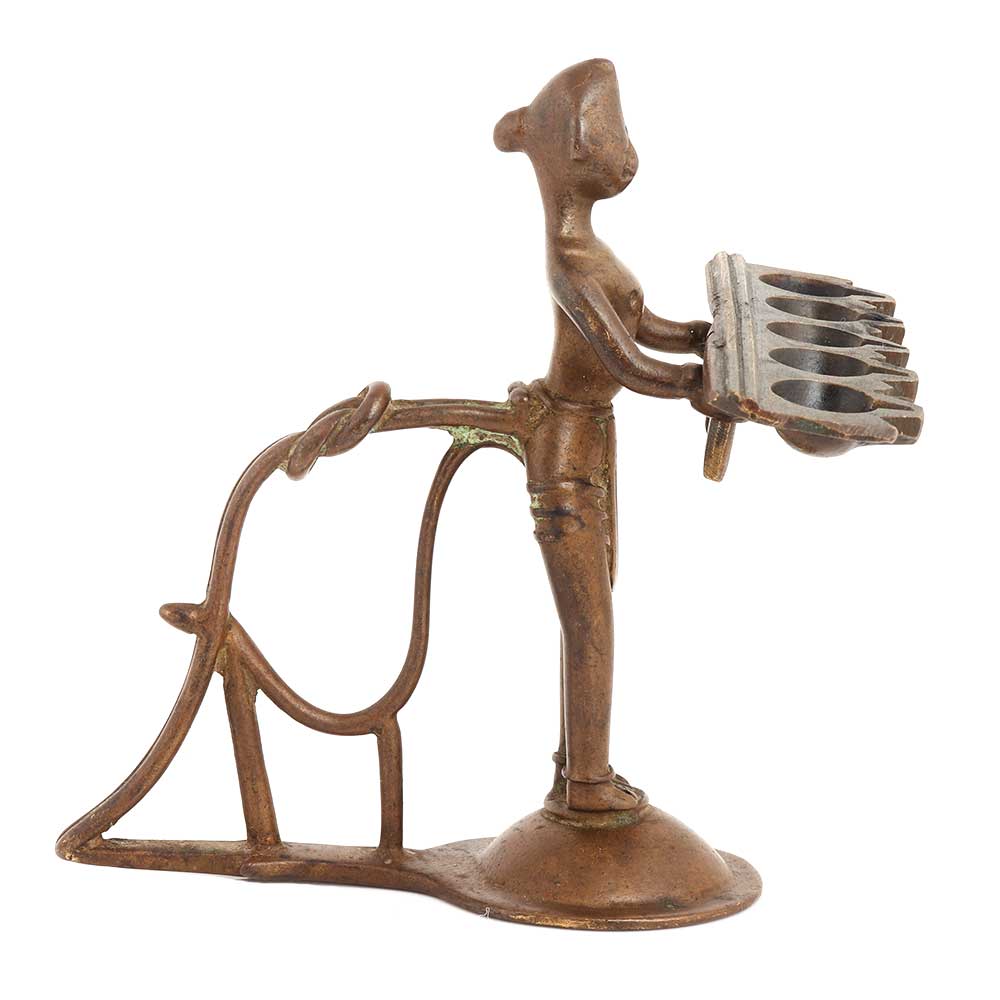 Handmade brass lady holding five faced oil lamp is a traditional diya, puja Item , spiritual decor, table decoration, diwali gift for your near and dear ones.