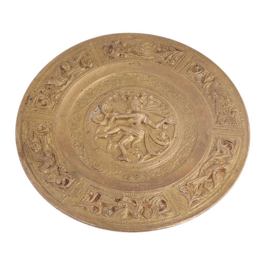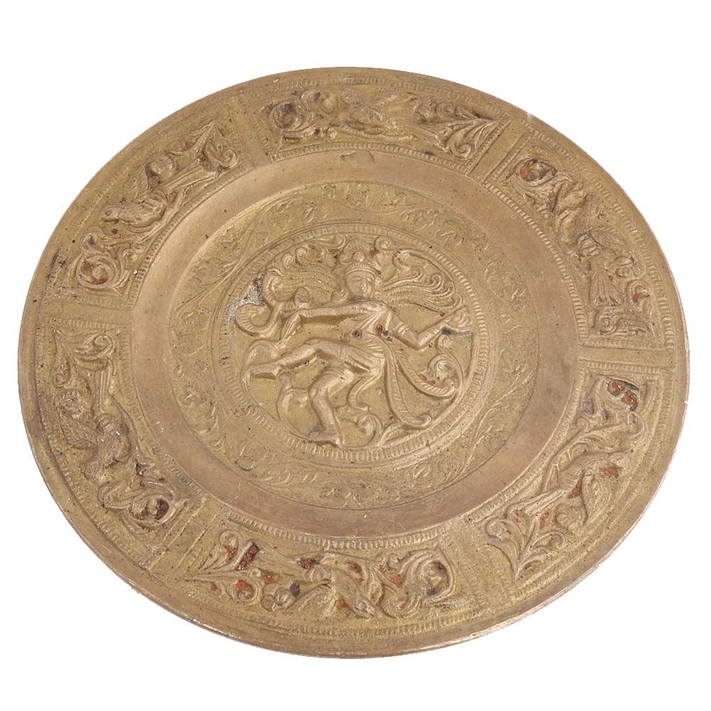 Decorate the interior walls of your home and office with this brass vintage plate that has decorative panels and engraved hindu deity nataraja. This carved metal plate is ready to be part of your collection.