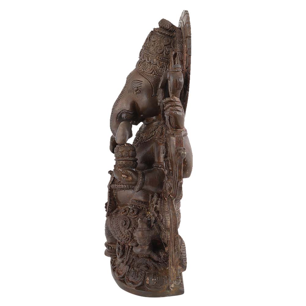 This auspicious brown brass sitting Ganesha murti or statue has intricate carvings and design that makes the perfect home decor accessory, showpiece, display it in home temple or puja Ghar. A good luck charm for your near and dear ones.
