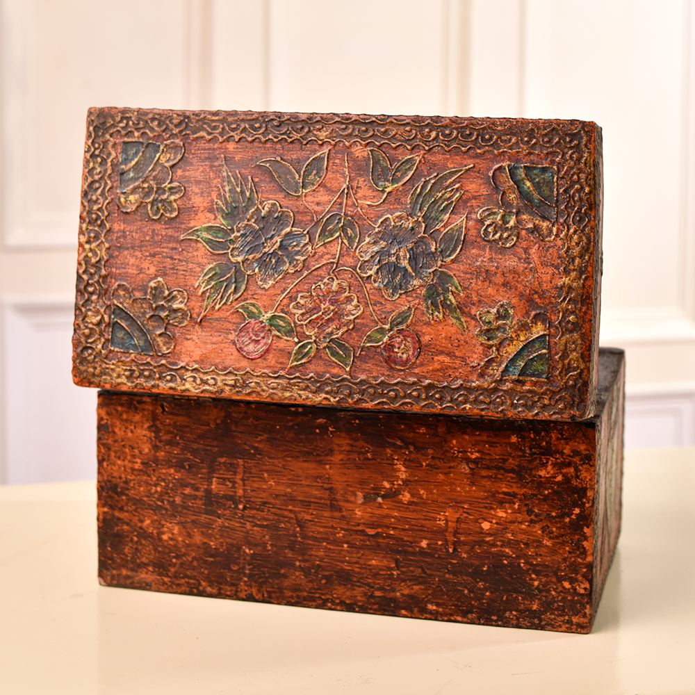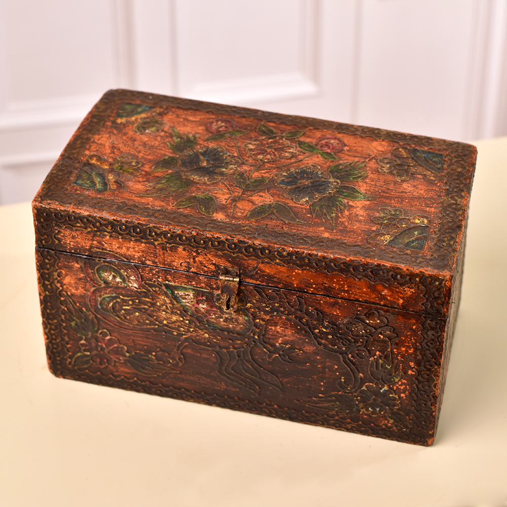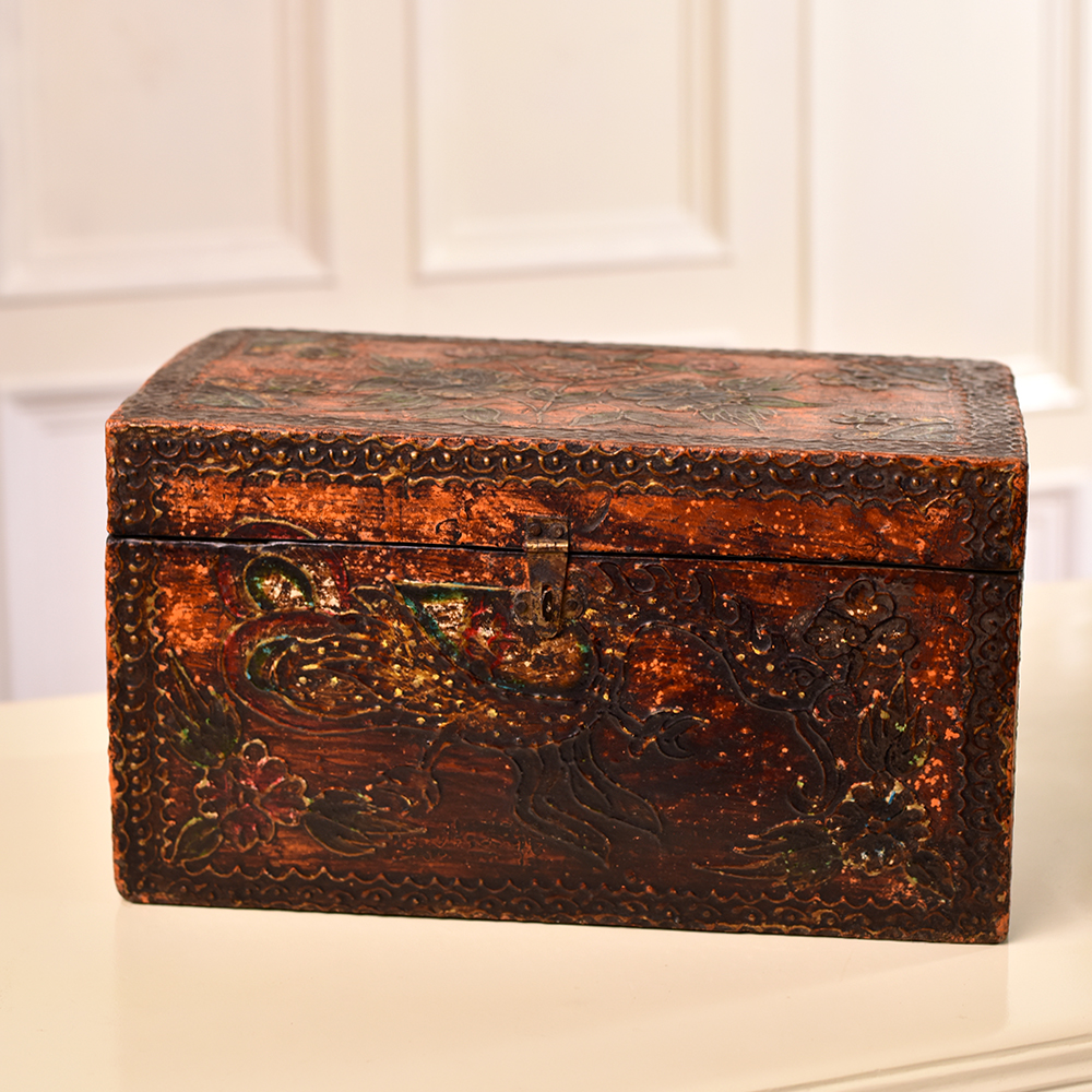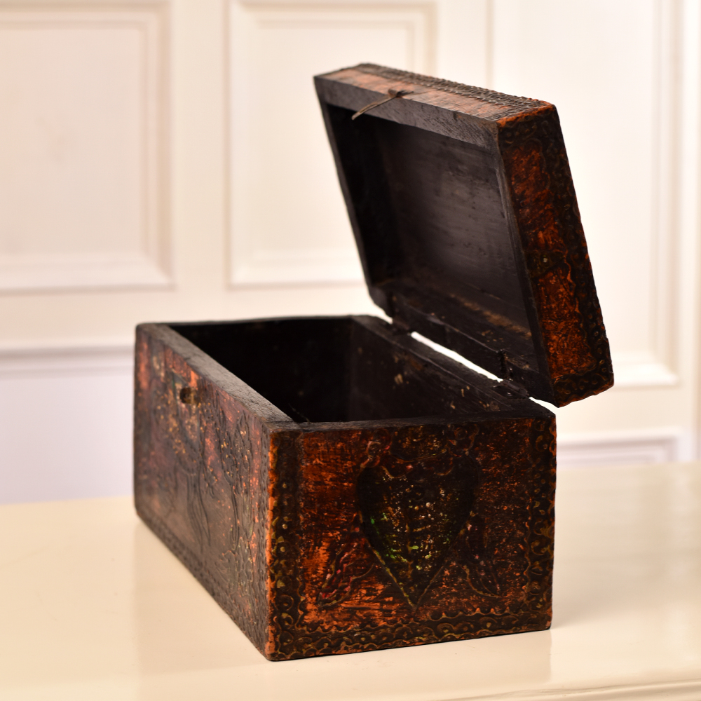 Buy a rectangular wooden box online that is a true masterpiece of craftsmanship and elegance. This beautiful box is adorned with intricate engravings that showcase the remarkable skill of Indian artisans, handcrafted from high-quality wood. Its antique brown finish adds a touch of timeless charm, making it a truly enchanting addition to your collection. This versatile box features a secure latch, making it perfect for safeguarding your precious jewelry and small keepsakes. Its spacious interior provides ample room for storing various treasures, ensuring your cherished items are always close at hand. Not only is this wooden box a practical storage solution, but it also serves as a captivating display piece. Its ornate engravings and rich, antique finish make it a conversation starter at any exhibition or gathering. This exquisite creation also makes for an ideal gift for your family, friends or relatives on special or festive occasions, expressing your affection with a touch of Indian artistry.