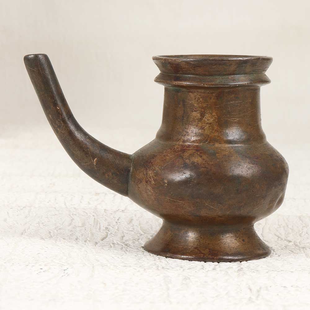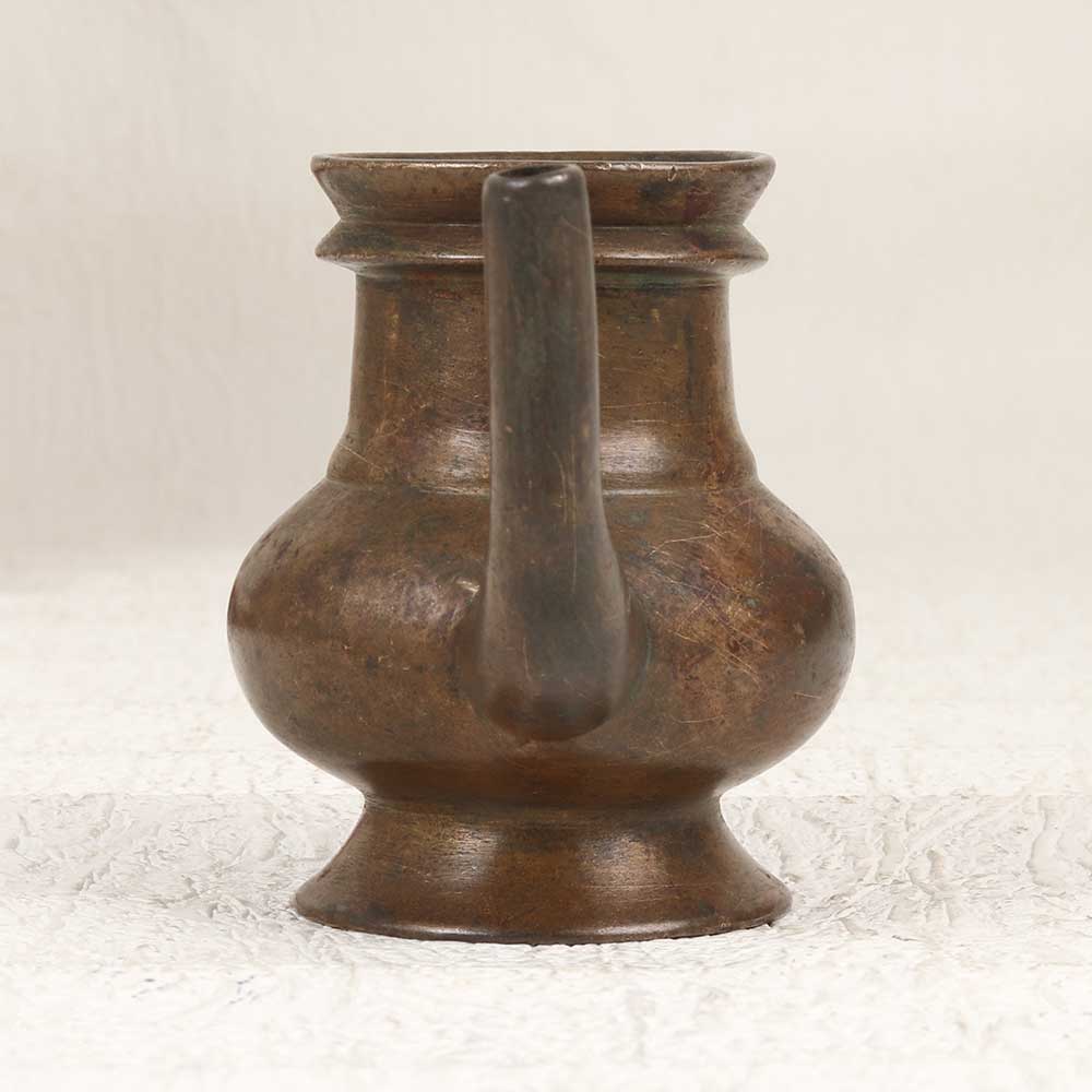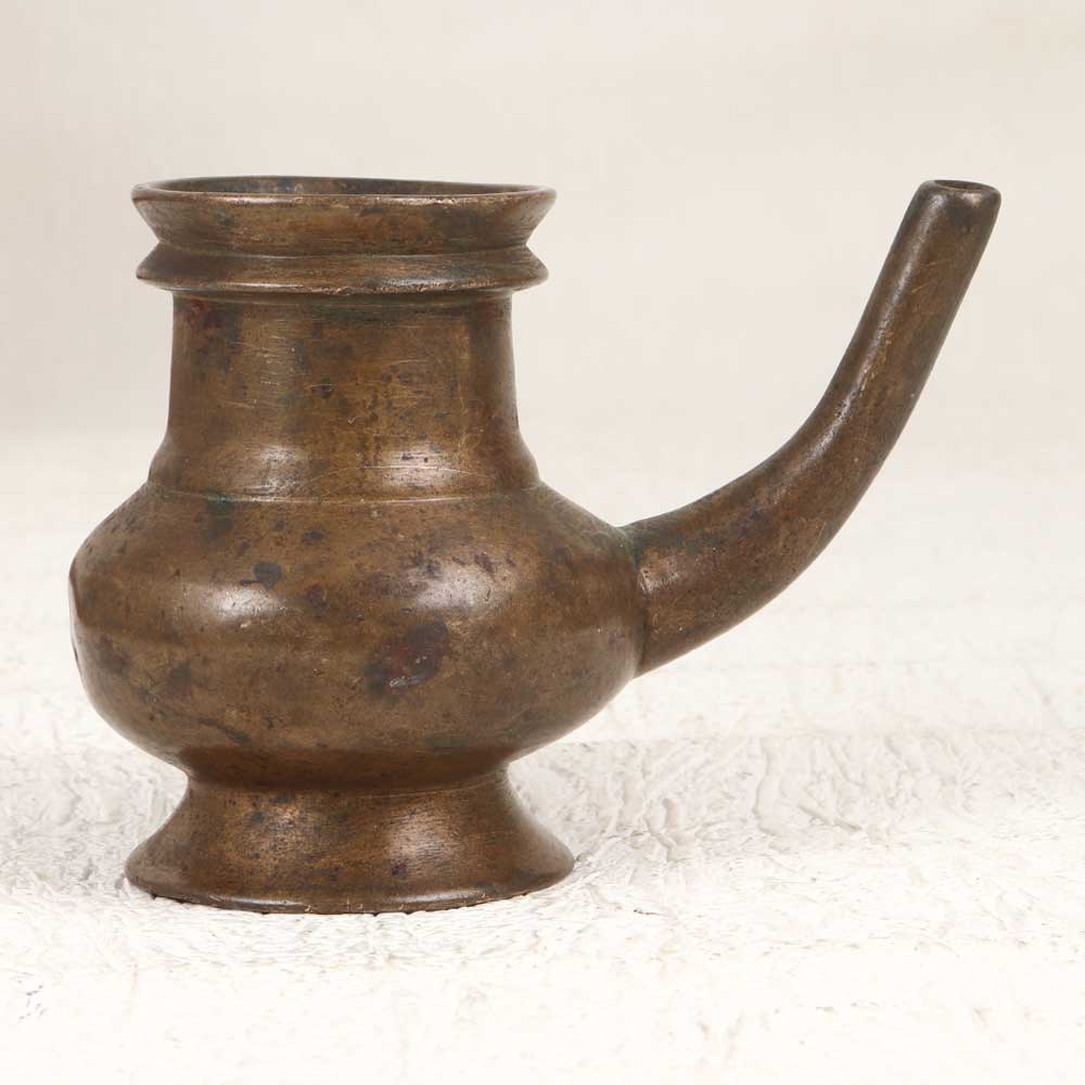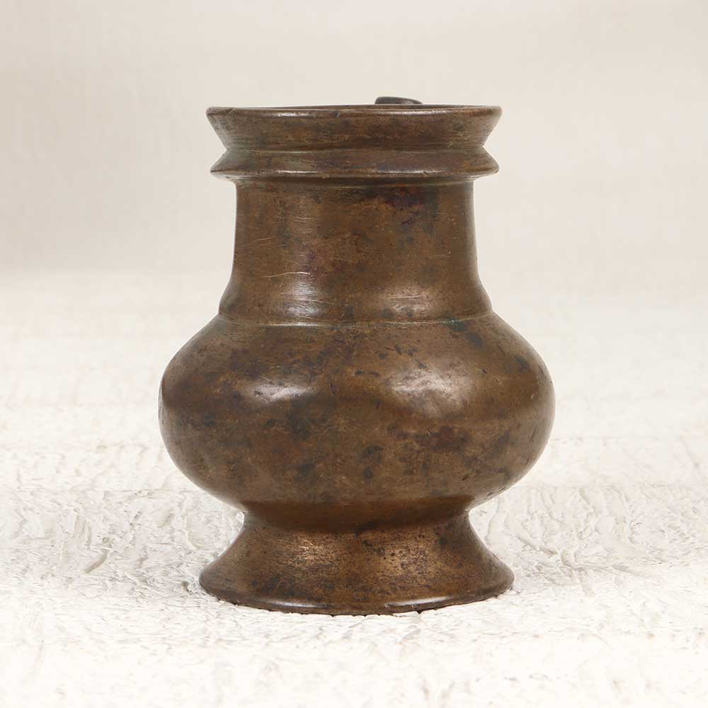 Channel exotic antique appeal with this vintage holy water pot engraved with graceful South Indian artistry. Featuring a curved spout, this brass vessel adds artistic intrigue to your home. Display this eye-catching pot prominently on your countertop or coffee table to infuse exotic charm into your home. Use it functionally to hold water for guests or rituals. The handmade craftsmanship provides an artistic, conversational focal point. For antique lovers, this Indian-inspired vessel evokes old-world mystique and cultural allure. Place it in your entryway or dining room to transport guests to another era. With its vintage styling and intricate regional designs, this holy water pot makes a stunning exotic statement piece.