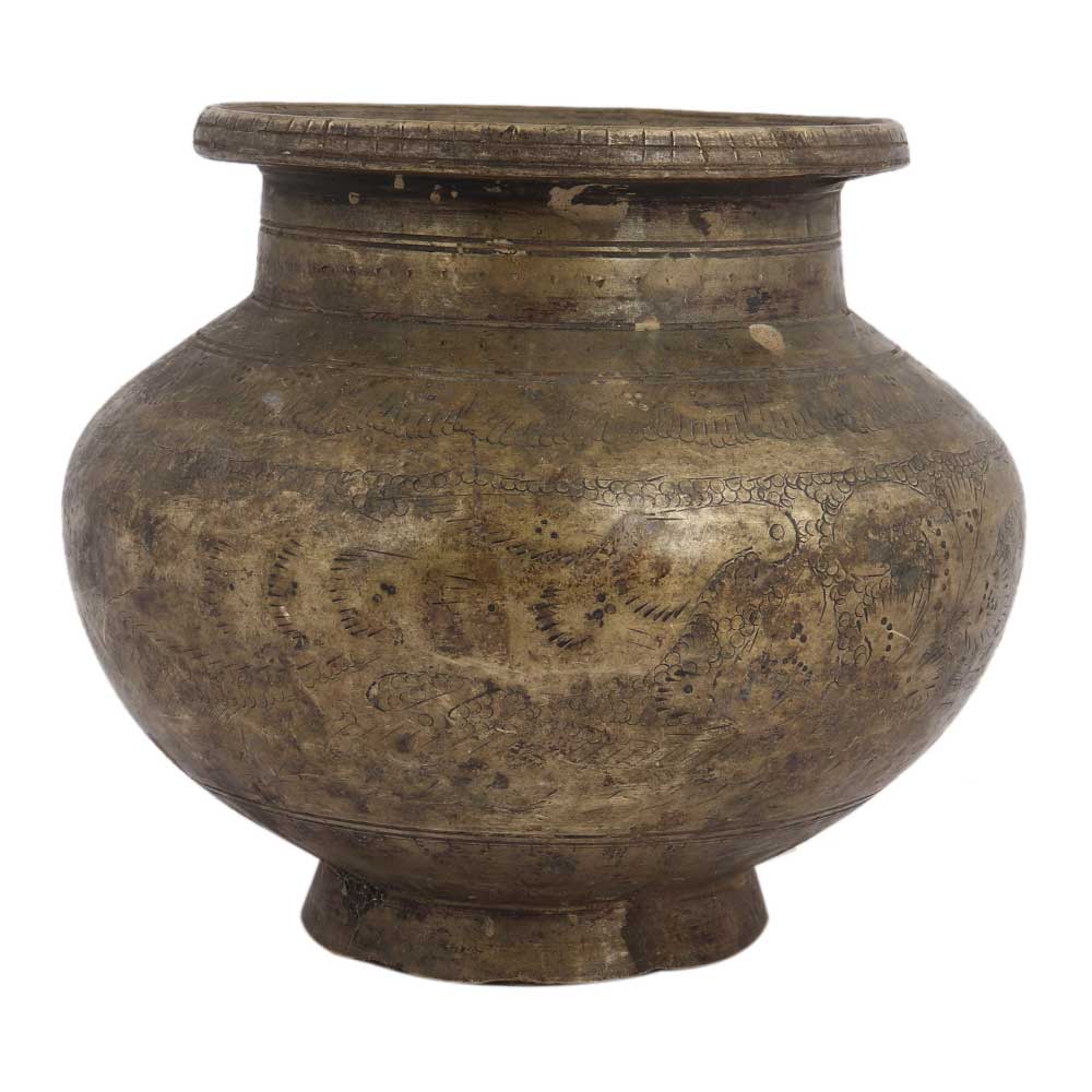 This brass pot features a gorgeous carved pattern of leaves and flowers in the centre and border. It can be used as a place of worship. In the pooja room, temples are used to keep holy water or to serve as a kalash. It has a patina to it.