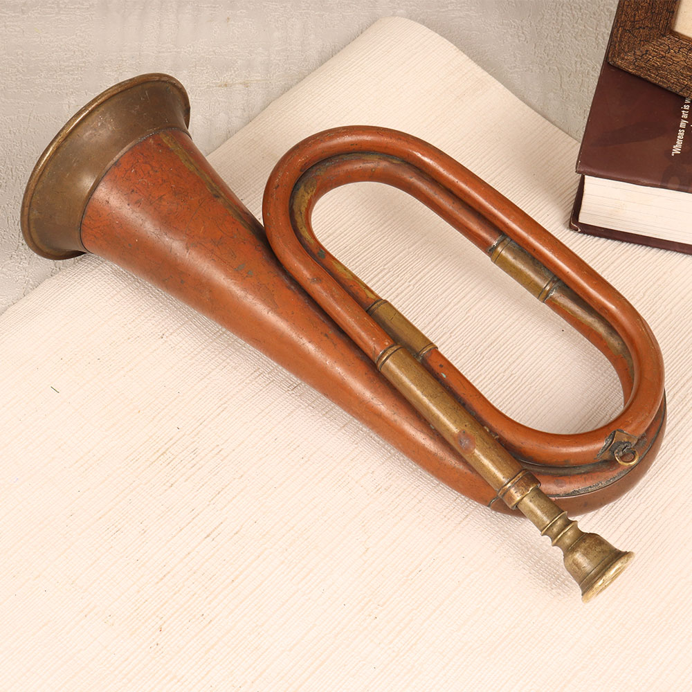 A Vintage Brass and Copper Bugle that is a masterpiece crafted by highly talented artisans in English Art. Handmade from high-quality brass and copper, this musical instrument boasts a rich antique brown finish that exudes a sense of nostalgia and sophistication. The bugle, with its classic design, adds a touch of elegance to any setting, be it your home, office, restaurant, hotel, or cafe. Its versatile appeal makes it a captivating decorative piece that seamlessly blends with various interior styles. Whether placed on a mantel, a shelf, or as a centerpiece, this bugle serves as a conversation starter and a testament to the beauty of craftsmanship. This exceptional bugle isn't just a decorative piece, it's an exquisite addition to any vintage collection. Its historical allure and artisanal quality make it a noteworthy heirloom that stands the test of time. Consider this Vintage Brass and Copper Bugle as a thoughtful gift for your family, friends or relatives on special, festive, or auspicious occasions.