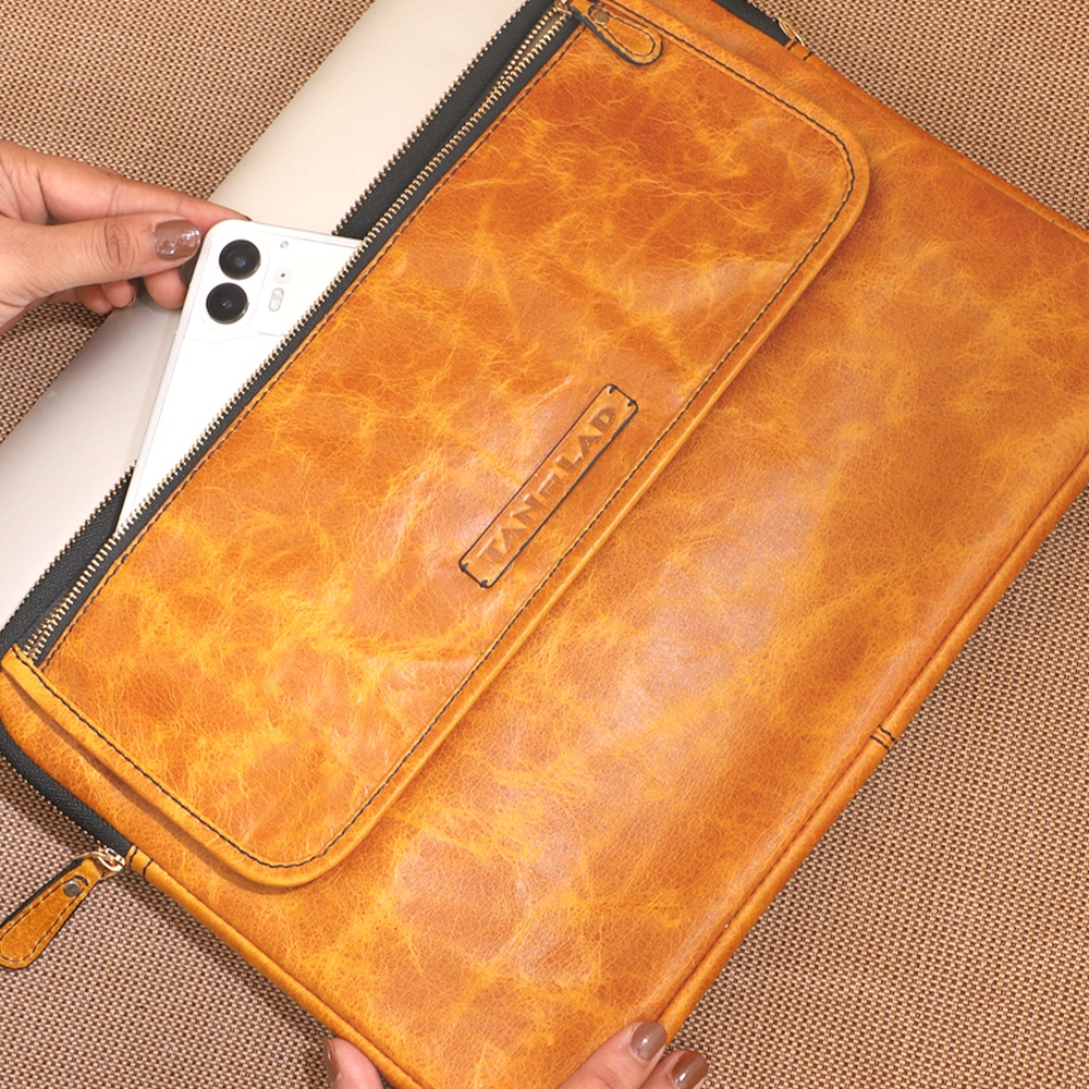 Crafted with amazing Butterscotch leather, it features a 2-way zipper closure, and the main compartment offers secure storage for your laptop or tablet. On the outside, youll find a hanging zipper compartment which is perfect for small accessories like chargers and pens. Adding to the smart design is a hidden pocket under the front compartment, providing discreet storage for documents or valuables you need to keep close but out of sight.