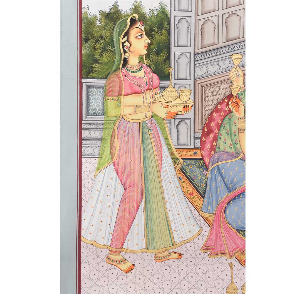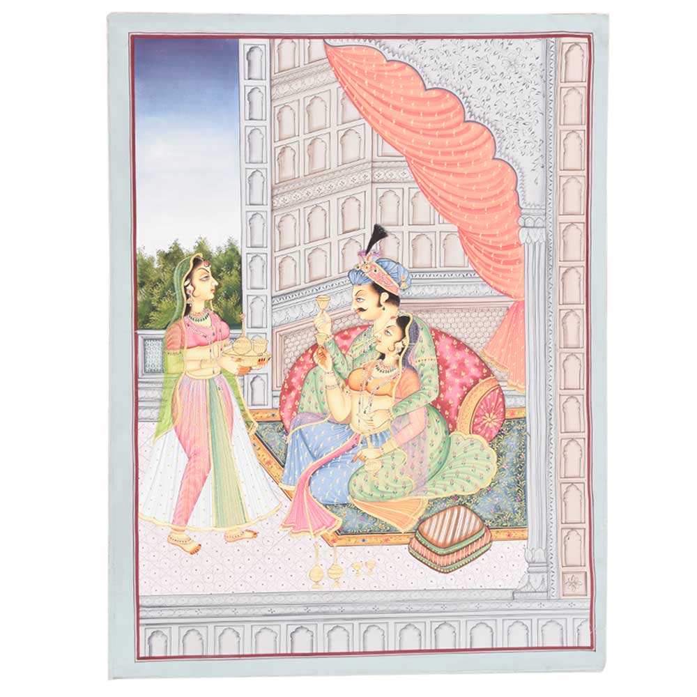 In this handmade Canvas painting, you can see king Mughal enjoying a romantic evening with the empress in the harem court. This painting is an ideal wall decoration for your home or office.