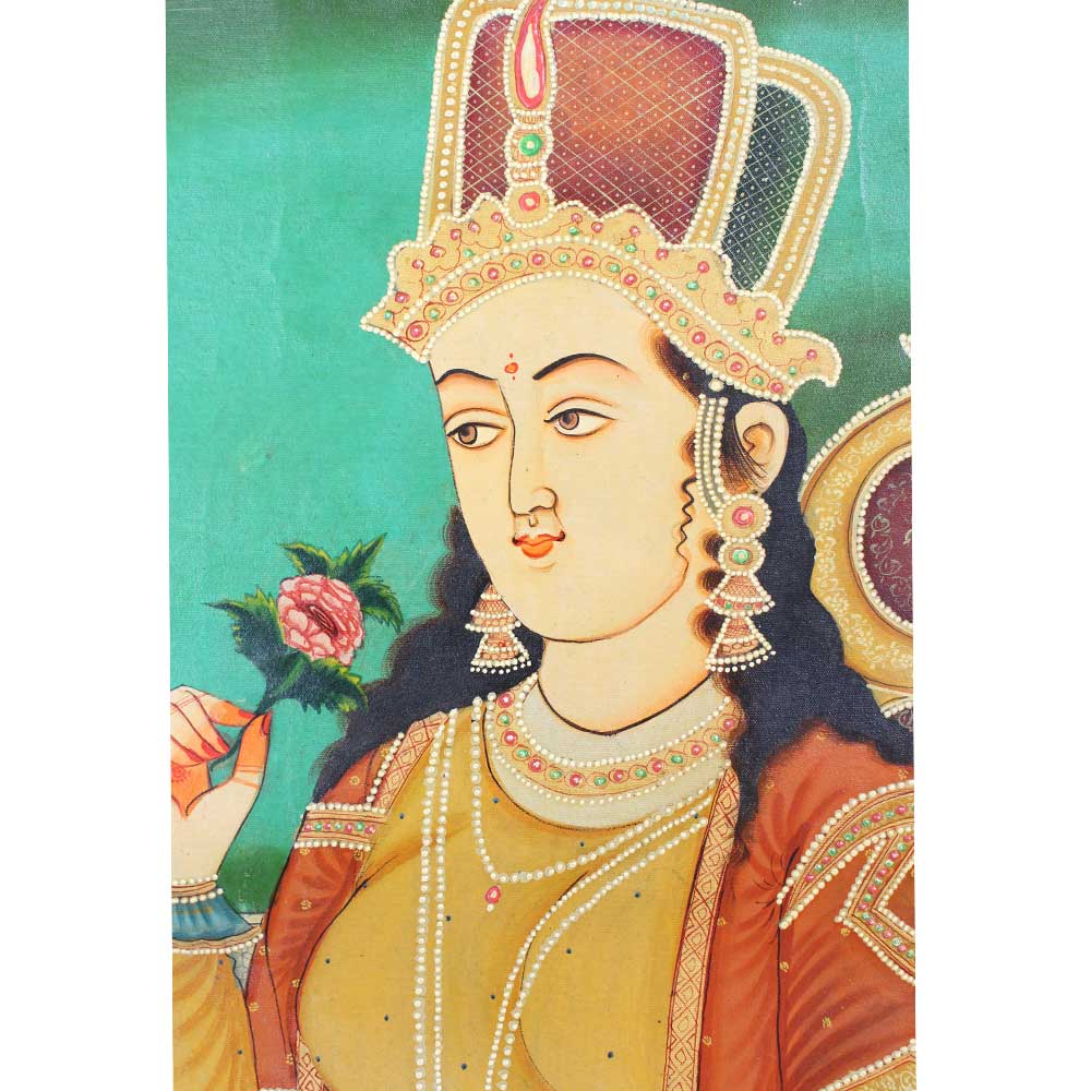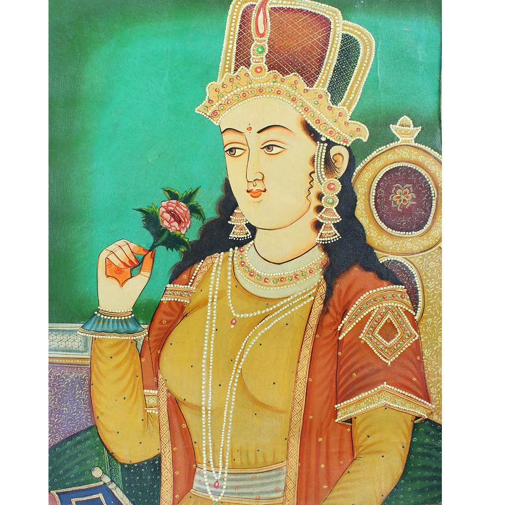 This handcrafted Mughal painting of the Mughal empress features stunning brilliant colours in both the clothing and the surroundings. It will be an excellent addition to your collection.