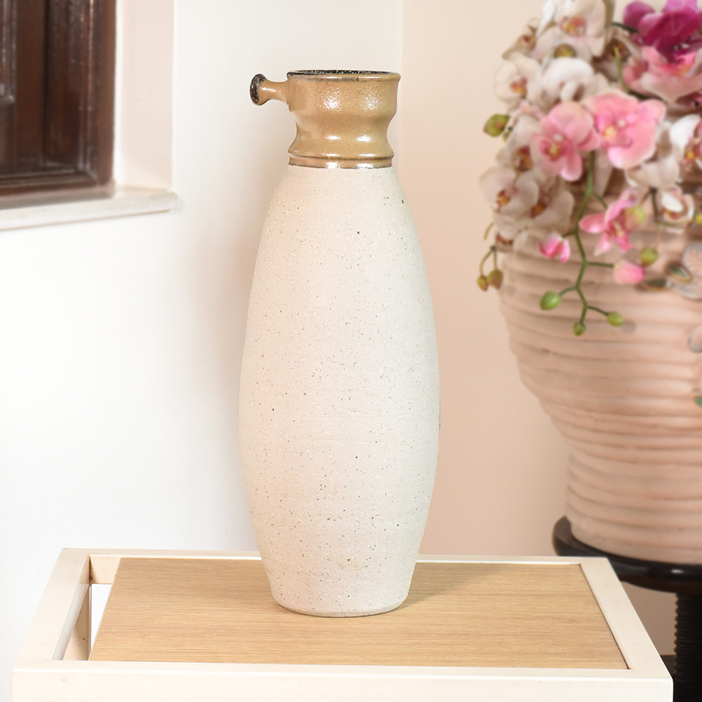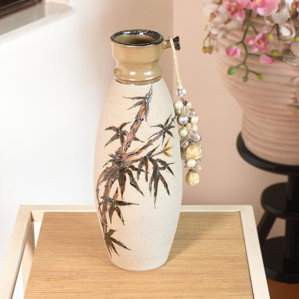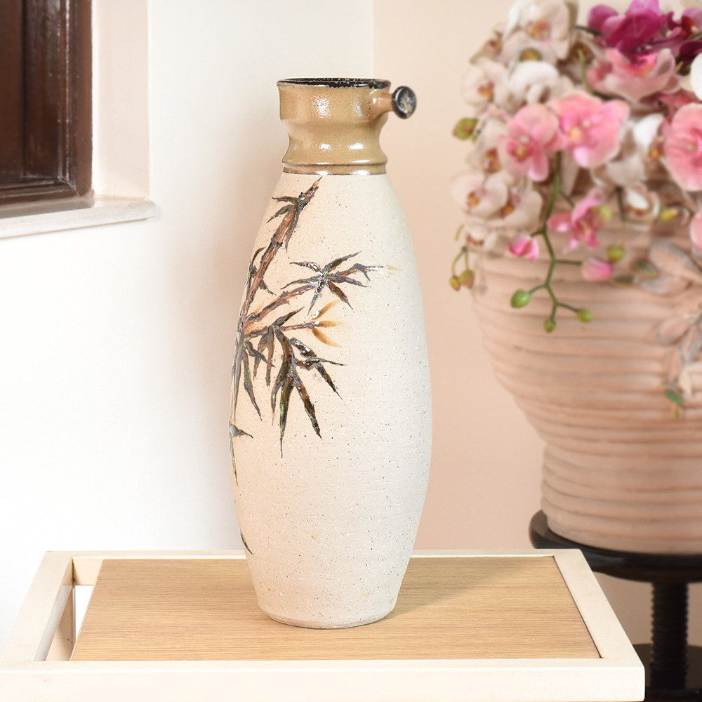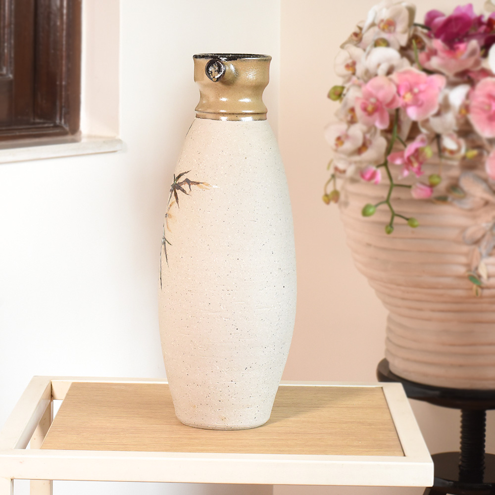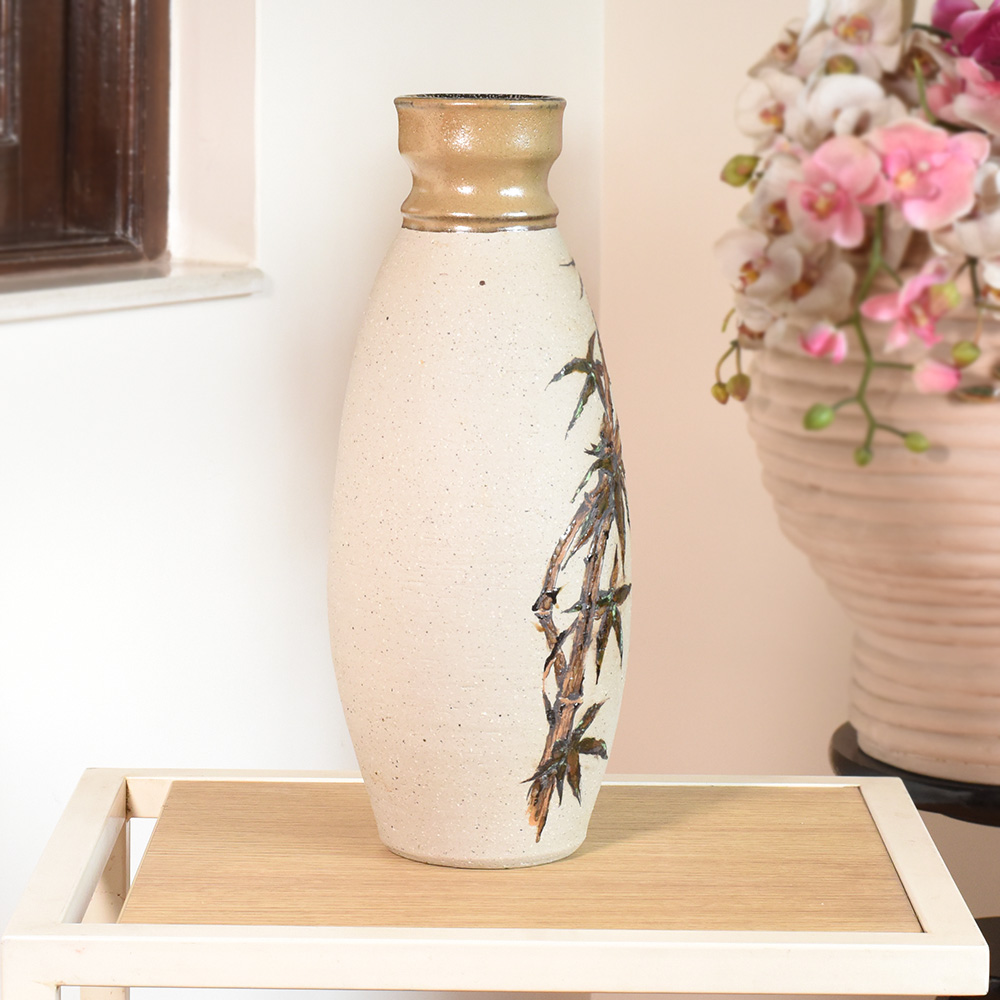 Ceramic Artist Meena Vohra brings her signature artistry to this bamboo inspired vase. The tall form features vertical grooves and warm tones offering a natural accent for organic and minimalist decor. Each piece is handmade packed and quality checked by Indianshelf. Bamboo Motif Vase with Natural Simplicity Inspired by bamboo canes the vase features vertical textures and organic lines. Its warm hues and slender silhouette lend a serene natural touch to shelves and tabletops. Tall vase featuring elongated grooves reminiscent of bamboo Shaped solely by human hands not machines Robust glaze guards against chips and scratches Materials and Making Process Origin: India. Safely packed and quality checked by Indianshelf Assembled and finished by artisans in their workshops Reliable construction serves decorative and functional use Inspirational Usage Tips Brighten office desks or creative studios Appropriate for festivals like Diwali or Christmas Eye catching accent for jewellery or fashion boutiques Enriches cultural festivals and craft showcases Preserving Your Bamboo Vase Use a soft duster and avoid water immersion. Store in a shaded area to protect the bamboo textured surface. Customer Questions What inspired the bamboo design The vertical ridges draw inspiration from bamboo stalks creating a natural motif. Is it tall and slender Yes its elongated form and narrow neck make it elegant and space saving. Can it be used with real flowers The vase is water friendly and suitable for fresh or dried arrangements. How should I clean it Wipe with a soft cloth and avoid harsh cleaners that could damage the texture. Keeping Craft Alive The object embodies the spirit of handcrafted heritage. Artisans invest time and skill in every piece creating uniqueness.
