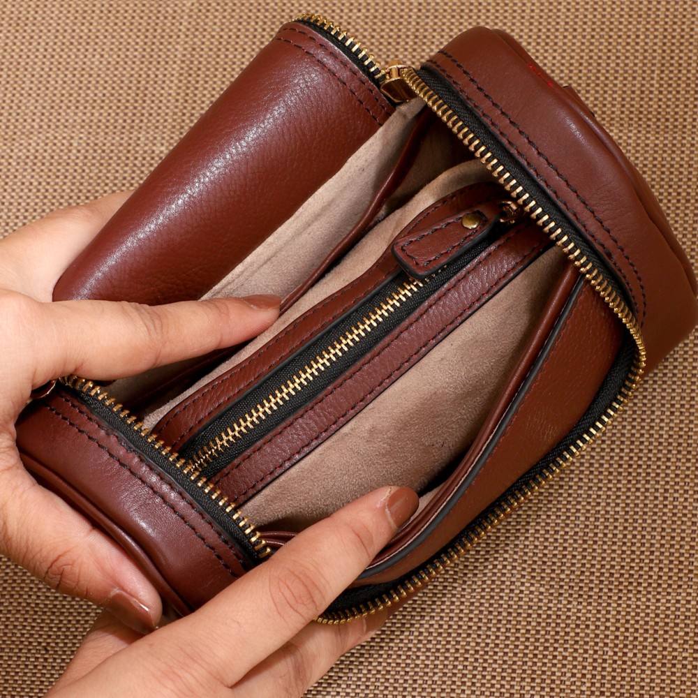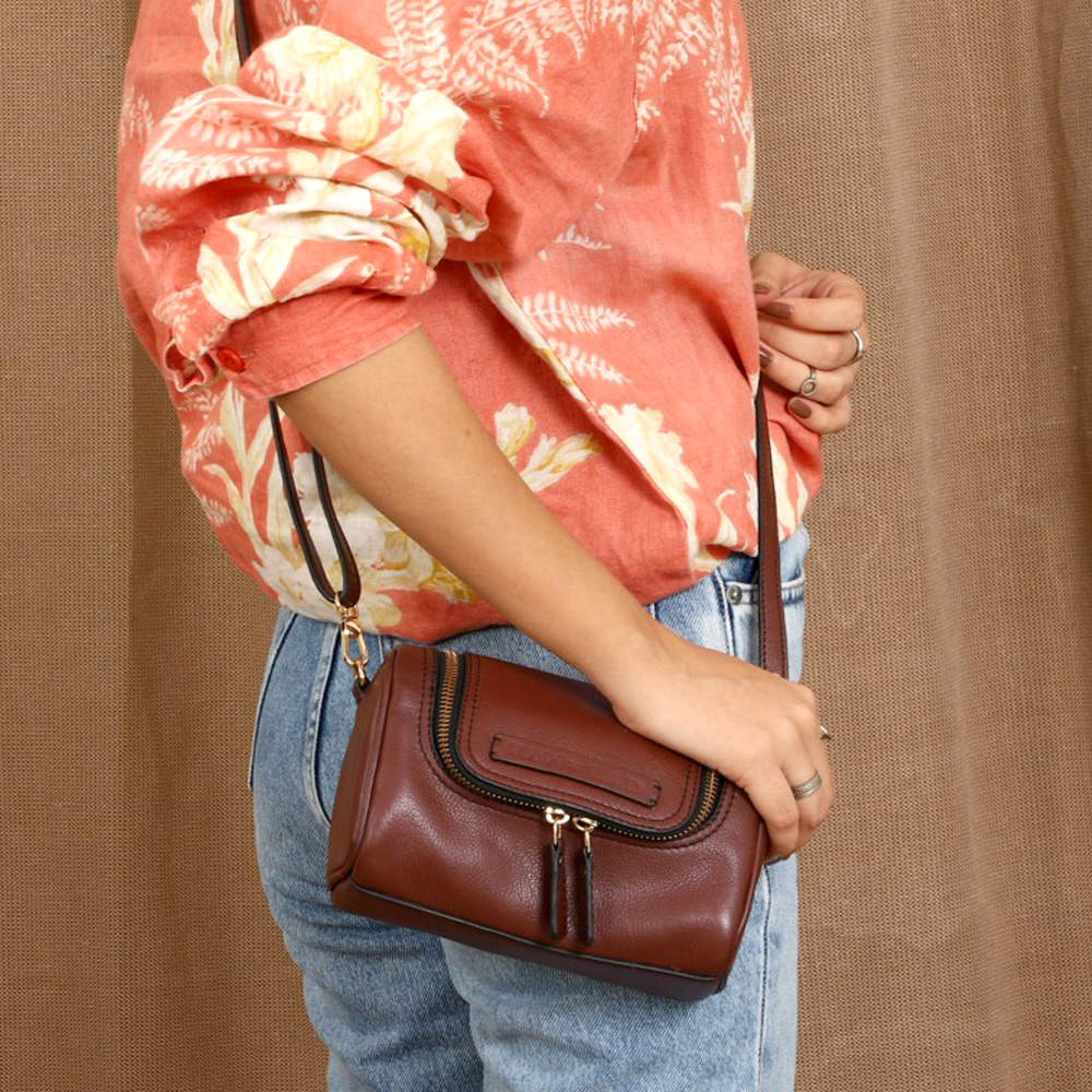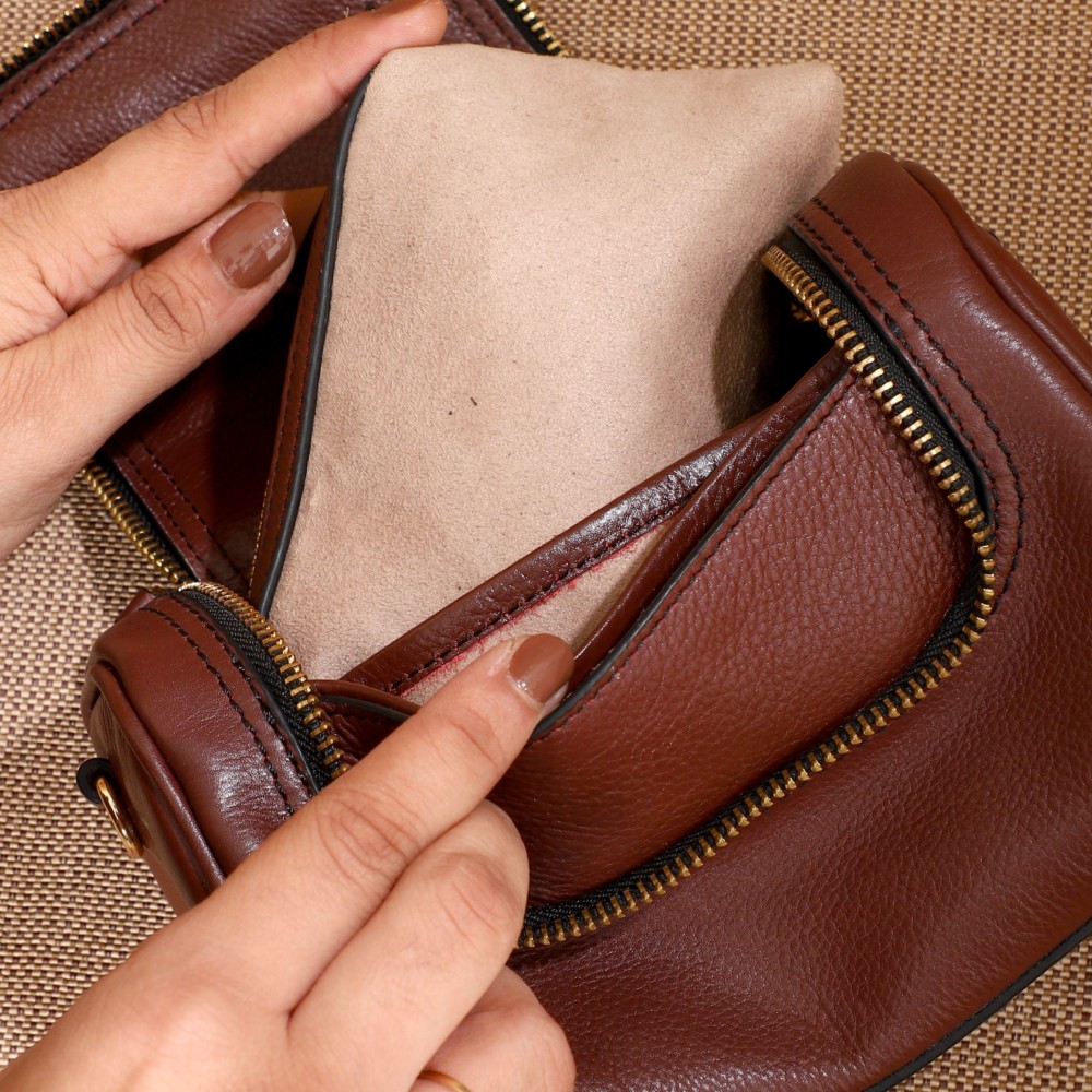 Crafted from gorgeous Cherry leather, it features a 2-way zipper closure and an adjustable, detachable crossbody sling, Lille offers comfort and convenience, whether you wear it as a crossbody or carry it as a stylish clutch. Under the flap, you'll find an open pocket on the front panel, ideal for storing items like your cards or cash for easy access.