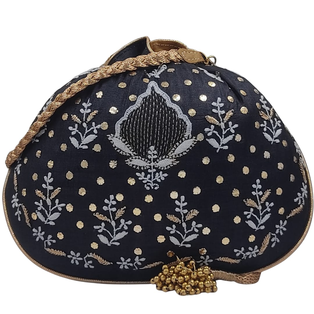 Add a dash of regal charm to your ensemble with this stunning handcrafted potli bag, made from rich tussar silk in a deep midnight black shade. Featuring traditional Chikankari embroidery on both sides, the design is further enhanced with intricate mukaish work, adding a subtle shimmer with its metallic accents. The blend of white threadwork and gold embellishments creates an elegant contrast that exudes sophistication and tradition. This potli is adorned with a beautifully braided handle and a functional drawstring closure, finished with pearl tassels on both ends for a luxurious touch. Compact yet spacious, it’s perfect for carrying essentials while making a style statement. Whether you're dressing up in a saree, an ethnic suit, or a chic Indo-western outfit, this potli adds the perfect finishing touch. Ideal for festive events, weddings, or special occasions, this bag effortlessly merges heritage craftsmanship with contemporary style.