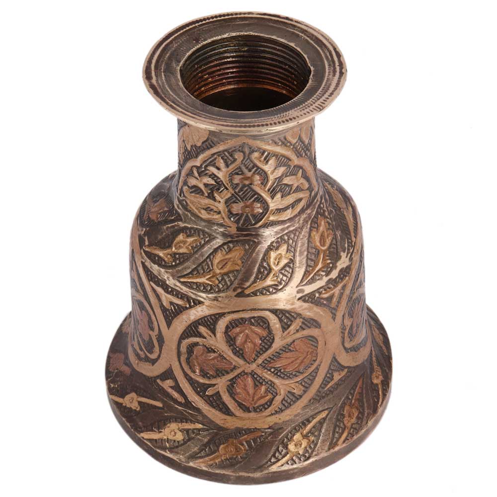 A hand carved vintage hookah base, most likely from India. It exudes a naive rustic charm and looks the part. The main body is brass, with copper finish and bell shaped base. The body is finished with a beautiful brass accent. It definitely has a handcrafted feel to it. Use it for home and hotel decoration.