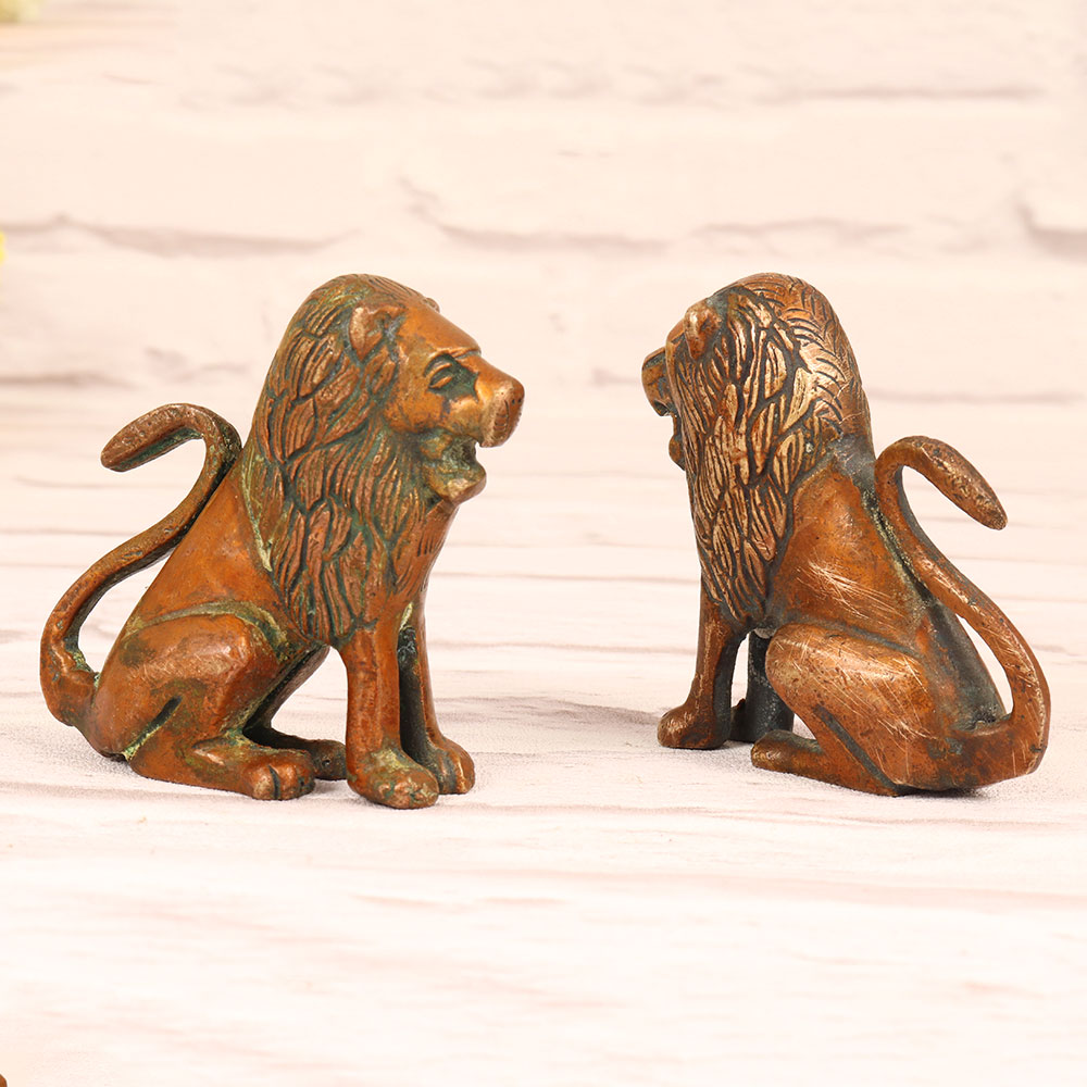Decorate your living room with the regal charm of our Brass Pair of Lion Statues in a captivating Brass finish. Crafted with meticulous attention to detail, these majestic sculptures showcase two lions in a dignified sitting position, exuding strength and grace. The statues boast an exquisite antique brown finish that adds a touch of timeless sophistication to any environment. Handcrafted by highly skilled Indian artisans, these lion statues are a testament to the rich heritage and craftsmanship that defines Indian artistry. Fashioned from high-quality brass, they exhibit a lustrous sheen that enhances their visual appeal. Whether adorning your home, office, restaurant, hotel, or cafe, these statues serve as a symbol of power and protection while imparting an air of cultural finesse. Perfect for any occasion, these lion statues make for a thoughtful and enduring gift. Share the beauty and significance of Indian craftsmanship with your family, friends or relatives on special, festive, or auspicious occasions.