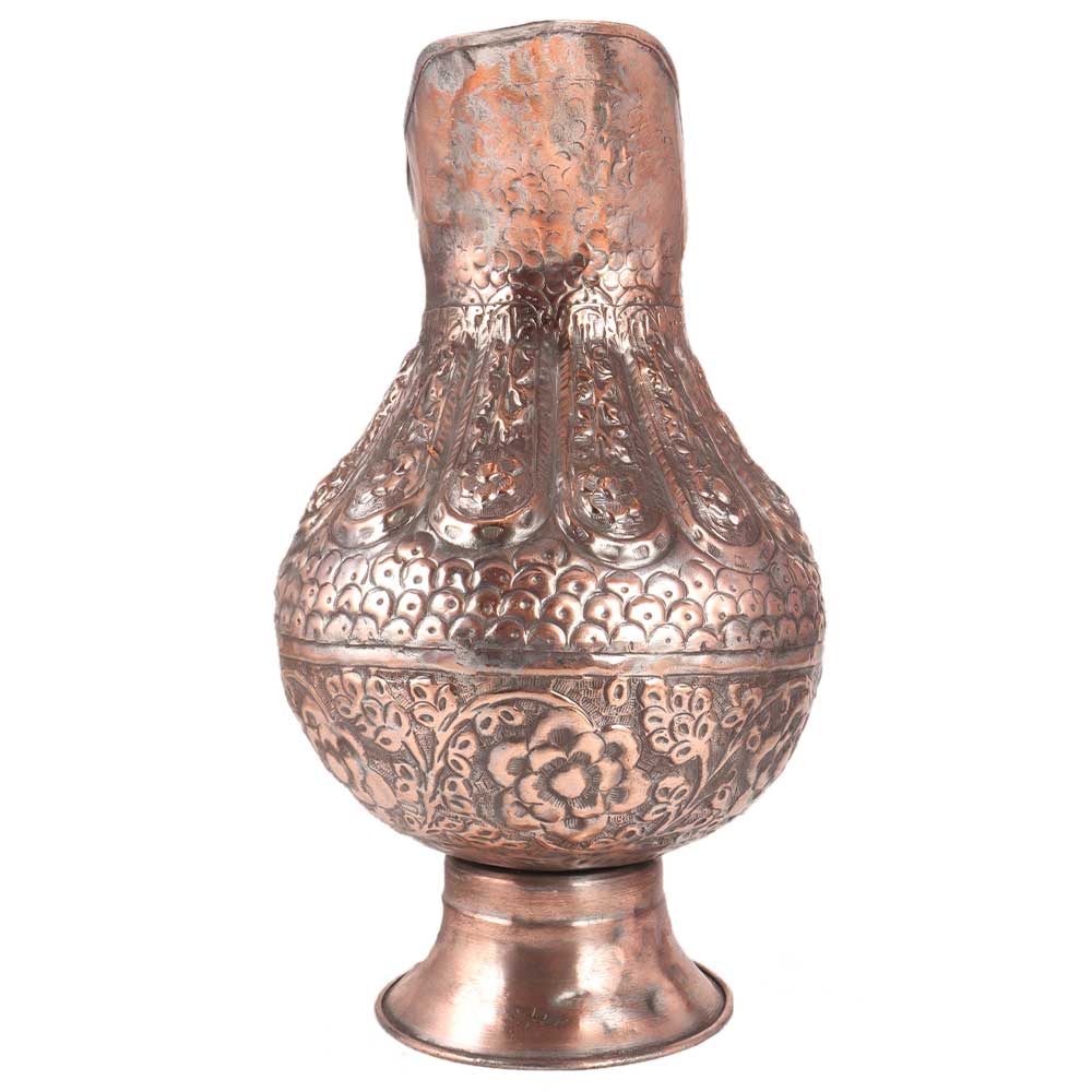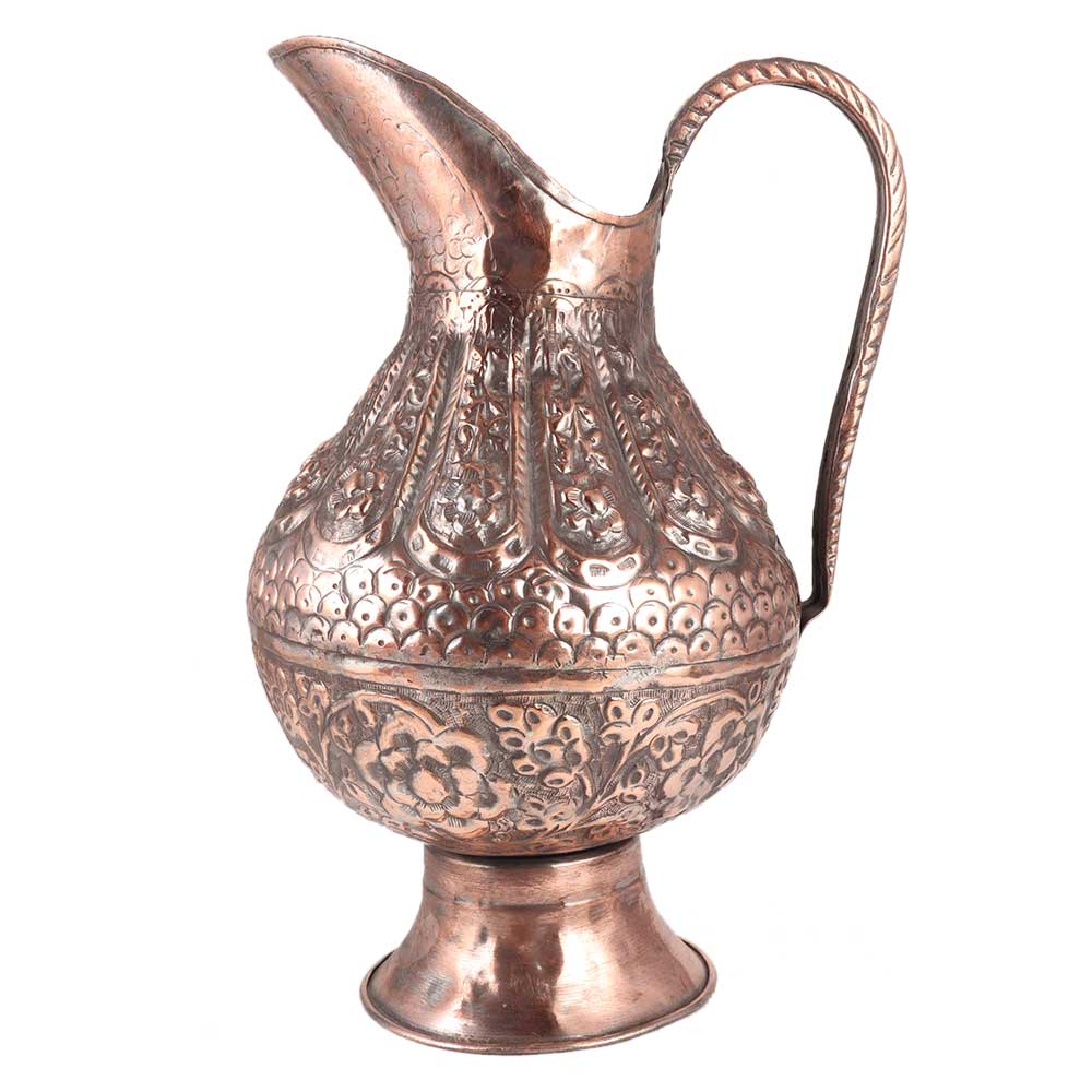 Pitcher in Islamic tinned copper Baluster-shaped jug with a round raised platform base and a scrolled curved handle with a wild terminal. The surface is repousse and heavily hand chased, with convex panels containing leafy floral sprays in low relief. The tin finish is slightly worn and has a nice age patina, indicating its age and usage.