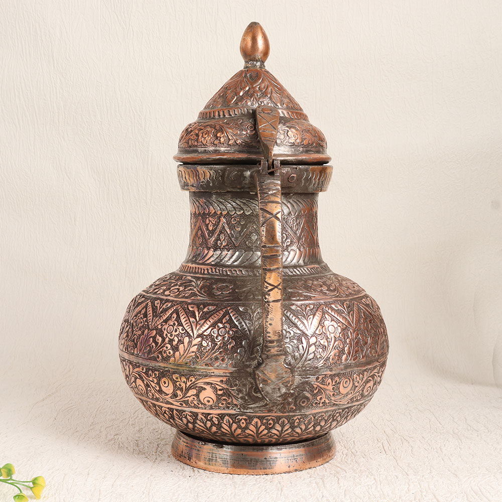 Enhance your decor with the timeless elegance of this exquisite Vintage Copper Kettle. Crafted by highly talented craftsmen in the tradition of Islamic Art, this stunning piece is a testament to craftsmanship and history. The kettle features intricate engravings that showcase the artistry and attention to detail that went into its creation. Its antique brown finish adds warmth and character to any space, making it a versatile addition to your home, office, restaurant, hotel, cafe, or shop. While it can be used as a functional kettle, we recommend reserving it for decorative purposes due to its vintage nature. Place it as a charming centerpiece, use it as a unique flower pot, or incorporate it into your vintage collection or exhibition display. This vintage copper kettle also makes for a thoughtful and memorable gift for your family, friends or relatives on special, festive, or auspicious occasions.