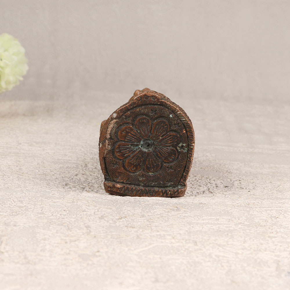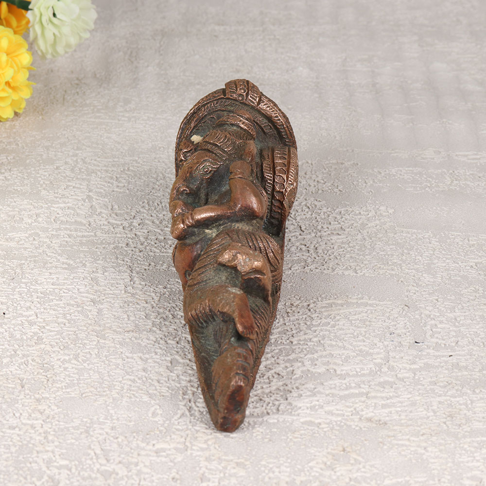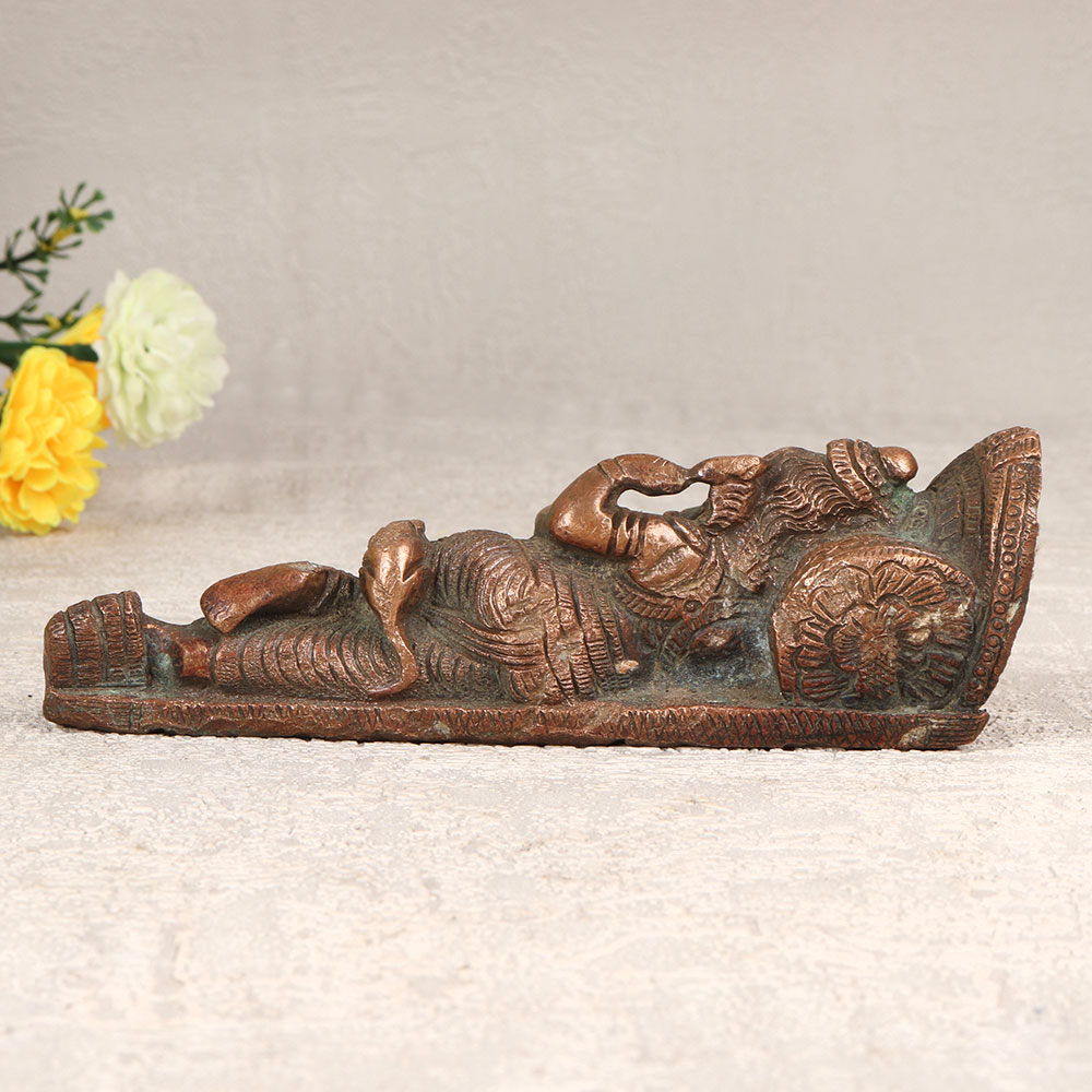 This Copper Lord Ganesha in a serene sleeping position is a masterpiece handcrafted by skilled Indian artisans in the revered tradition of South Indian Art. This divine creation boasts a resplendent antique brown finish, adding a touch of timeless elegance to any space. Crafted with precision and devotion, this Ganesha sculpture is made from high-quality copper, showcasing the artisan's commitment to excellence. The intricately detailed design captures the essence of Lord Ganesha in a state of tranquil repose, symbolizing peace and harmony. This stunning piece transcends mere décor, it is a spiritual centerpiece suitable for a variety of settings. Whether adorning your home, office, restaurant, hotel, or cafe prayer room, its presence radiates positive energy. Ideal for vintage collectors, this handmade artefact is a testament to the rich cultural heritage of India. Perfect for gifting, this Copper Lord Ganesha is a thoughtful gesture for your family, friends or relatives on special, festive, or auspicious occasions.