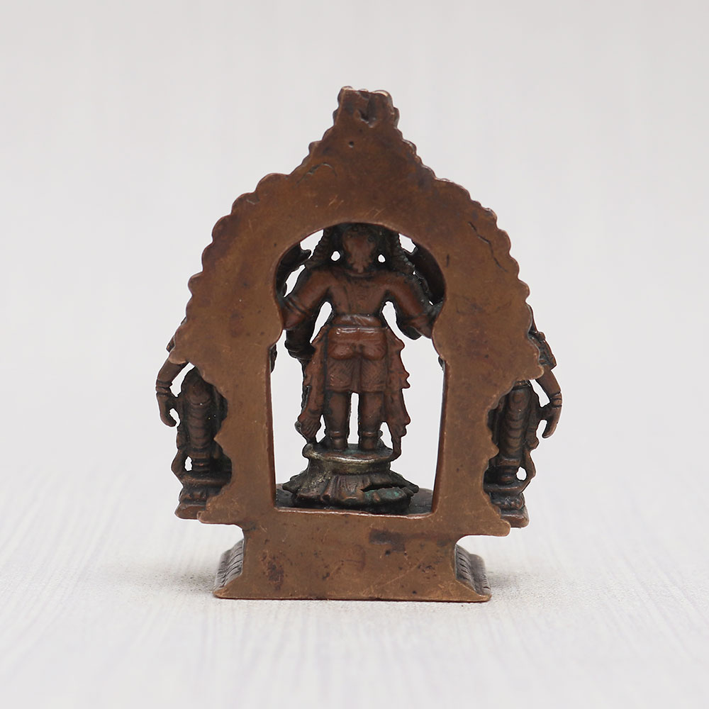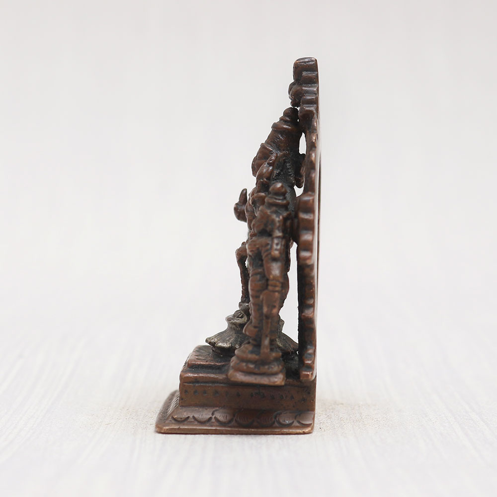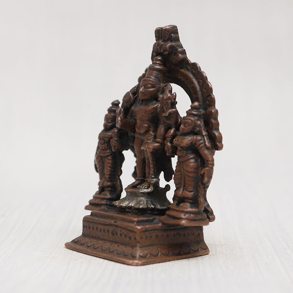 Buy a copper statue of Lord Srinivasa online that depicts Lord Srinivasa standing with his celestial consorts Sridevi and Bhudevi on a meticulously crafted platform adorned with a resplendent prabhavali frame. Handmade by professional Indian craftsmen using high-quality copper, this statue exudes elegance with its vintage-style finish. A perfect addition to your prayer room at home, office, restaurant, or cafe, it captivates with its eye-catching detailing, making it a must-have for exhibitions, decorations, and collections. Experience the divine aura it brings to your space as you buy idols online. Moreover, it serves as an auspicious gift for your family, friends or relatives on special, festive, or auspicious occasions, spreading blessings and joy.