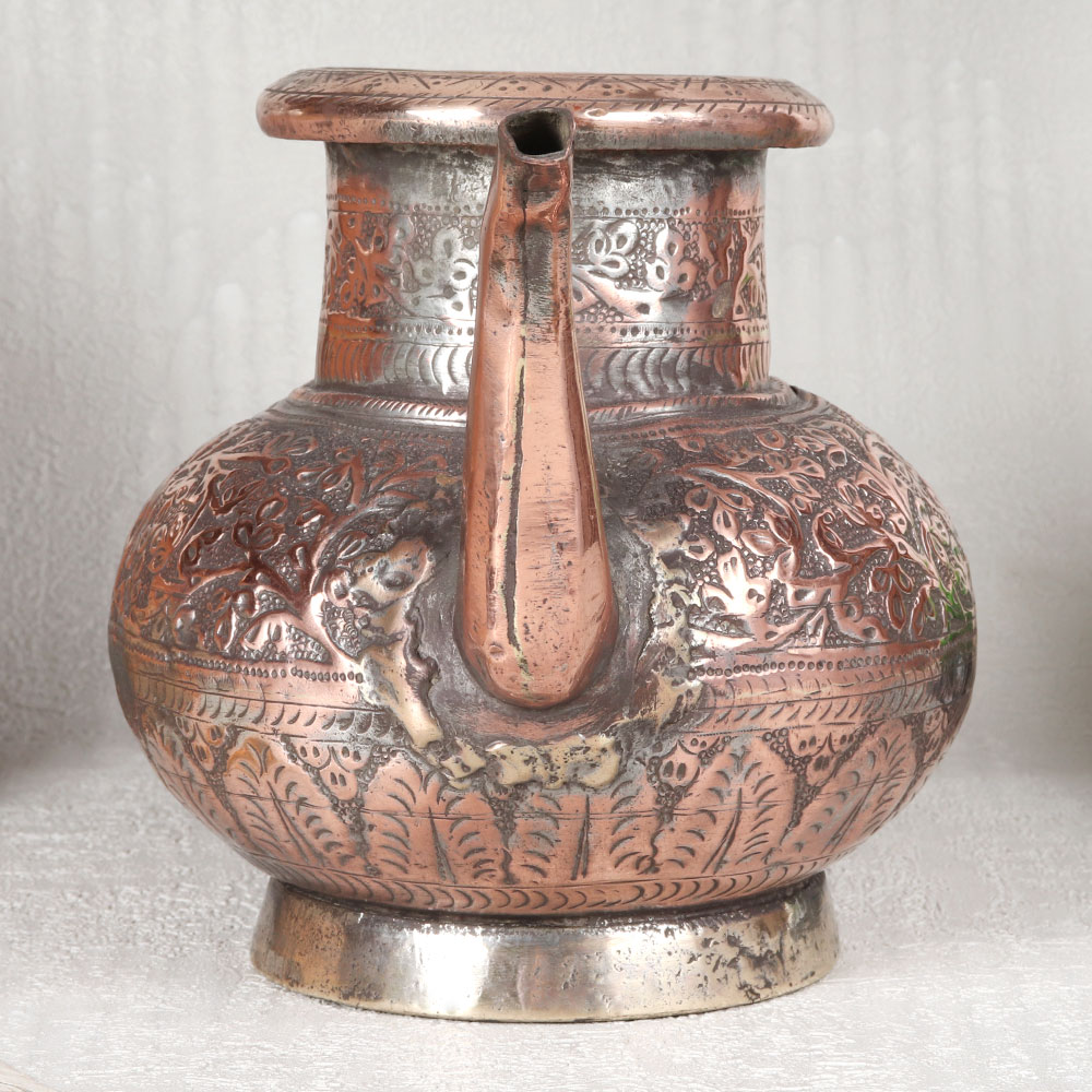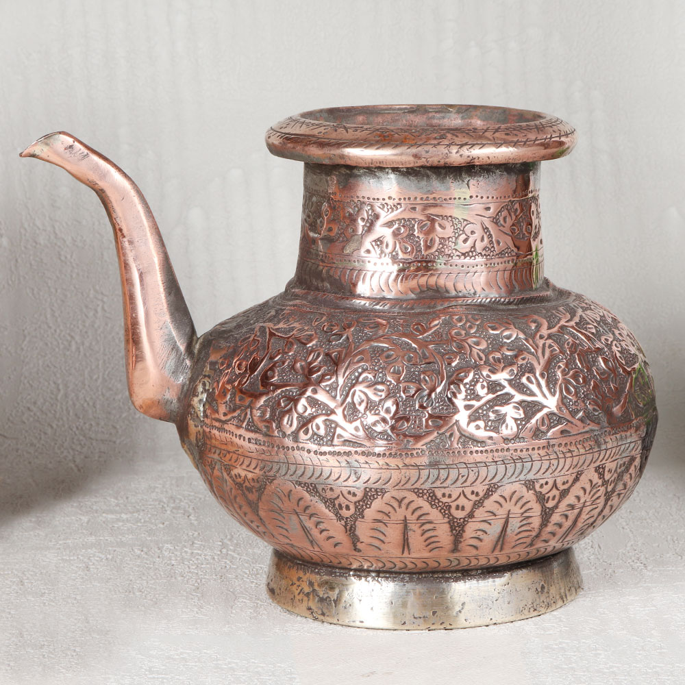 Buy a Copper Water Pot with Spout online that is a timeless piece of artistry that harks back to a bygone era. This stunning pot boasts an antique brown finish that adds an air of elegance to any setting. Its surface is adorned with intricate engravings, showcasing the craftsmanship of highly talented Indian craftsmen who have meticulously crafted it using high-quality copper. The pot, steeped in Islamic Art influences from the historic city of Hyderabad is a versatile addition to your surroundings. It can grace your home, office, restaurant, hotel, or cafe prayer room, instantly enhancing the ambiance with its aesthetic charm. This piece is equally at home in temples, becoming an integral part of rituals and ceremonies. For vintage collectors, it's a treasure, and for exhibitors, it's a captivating centerpiece. This pot makes for a thoughtful and meaningful gift for your family, friends or relatives on special, festive, or auspicious occasions, preserving traditions and celebrating the beauty of Indian craftsmanship.