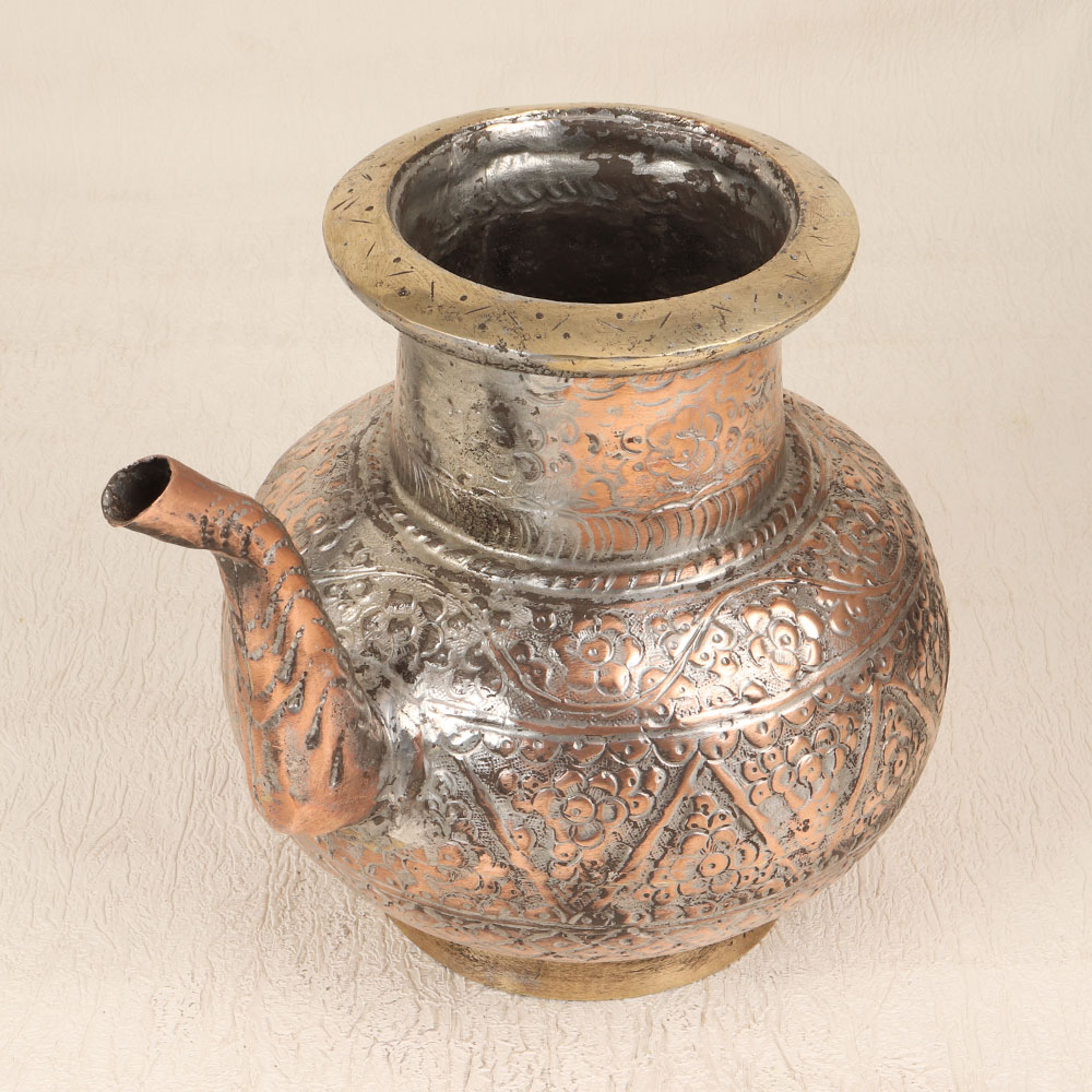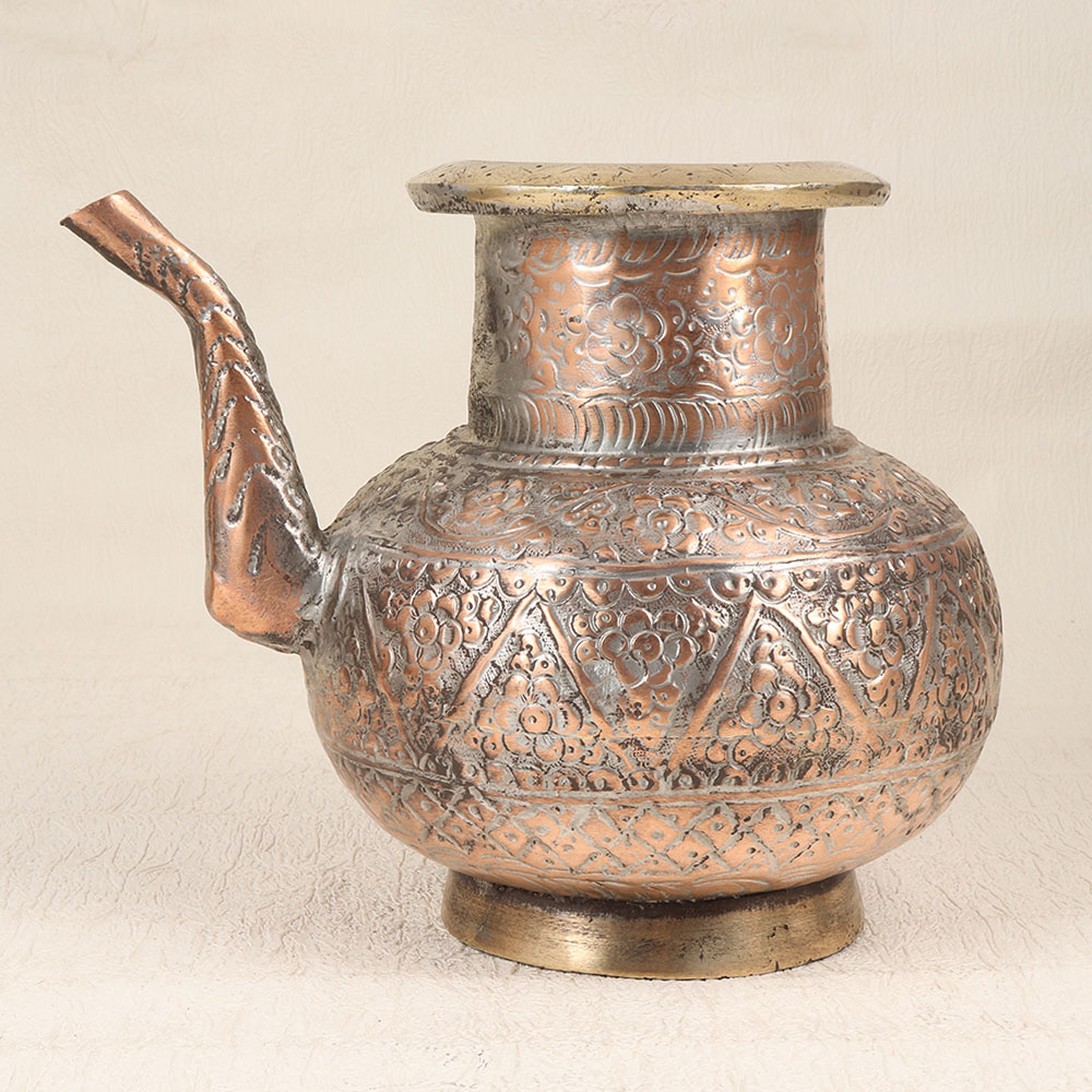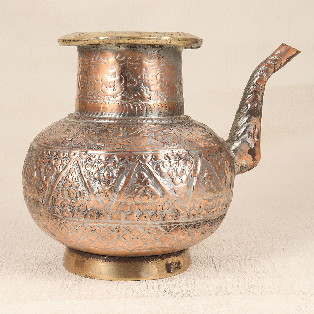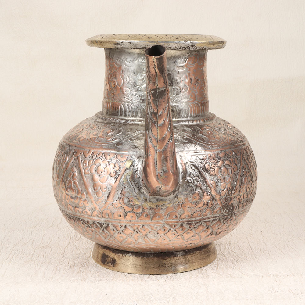 With its vintage copper design and Islamic engraving, this elegant water pot brings an antique elegance to your countertop. Featuring intricate engravings in a classic Islamic art motif, this pot makes a stunning statement. The rich, warm copper finish gives this pot a refined, time-worn look that gets more beautiful with time and use. This pot is built to last for generations and become a treasured heirloom. With its ornate details and timeless copper design, this engraved water pot brings old-world sophistication and charm to your kitchen. An elegant yet functional piece, it makes a thoughtful gift or self-treat for the traditional home.