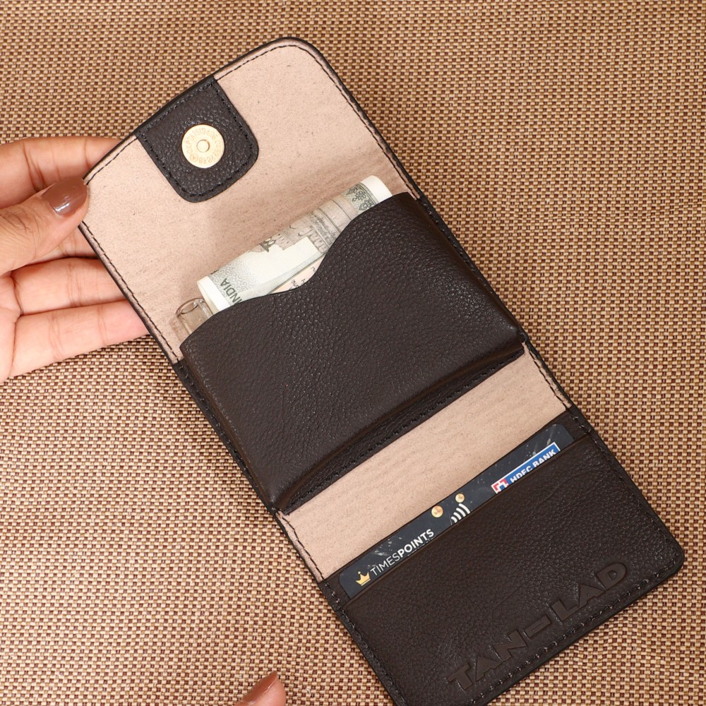 Crafted in gorgeous Cork and Ganache leather, it has two single card slots, perfect for your daily cards, and a spacious main compartment to store cash, coins, or small knick-knacks. Its sleek, minimalist design makes it ideal for everyday use, whether tucked into your pocket or slipped into your bag.