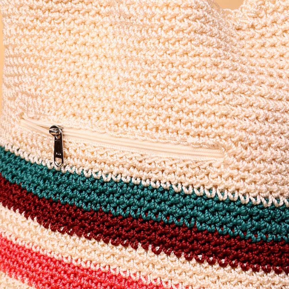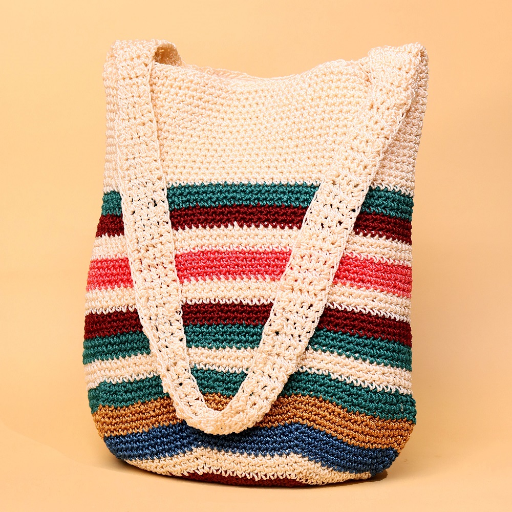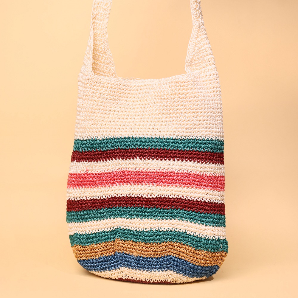 Add a touch of boho charm to your everyday style with this handmade crochet tote bag. Featuring vibrant multicolor stripes on a natural cream base, this spacious and lightweight bag is perfect for casual outings, shopping, beach trips, or daily use. The soft yet sturdy crochet design offers both comfort and durability, while the wide shoulder straps provide ease of carrying throughout the day. Whether paired with summer dresses, casual wear, or beach outfits, this bag is the ultimate blend of functionality and fashion. Its eco-friendly handcrafted design makes it a must-have accessory for free-spirited fashion lovers.