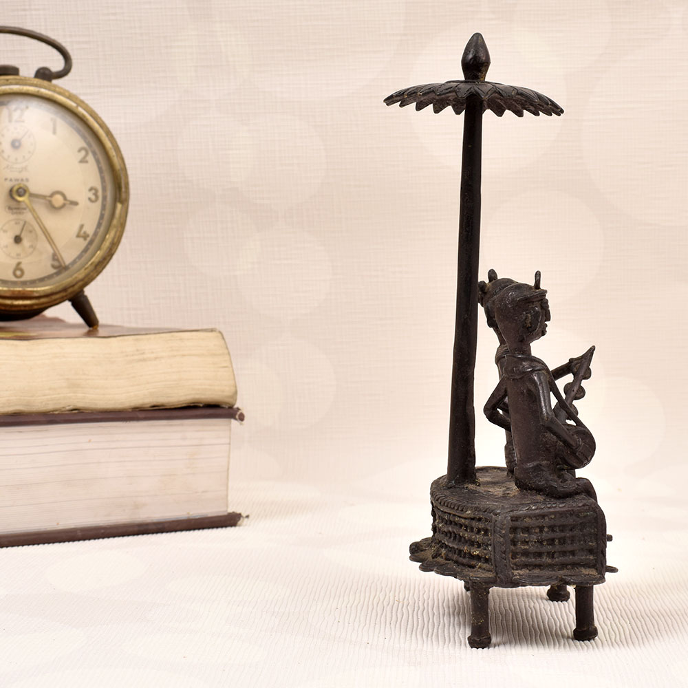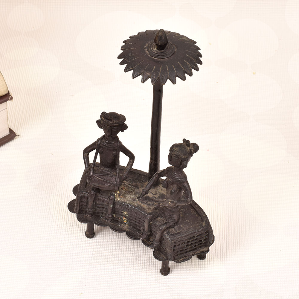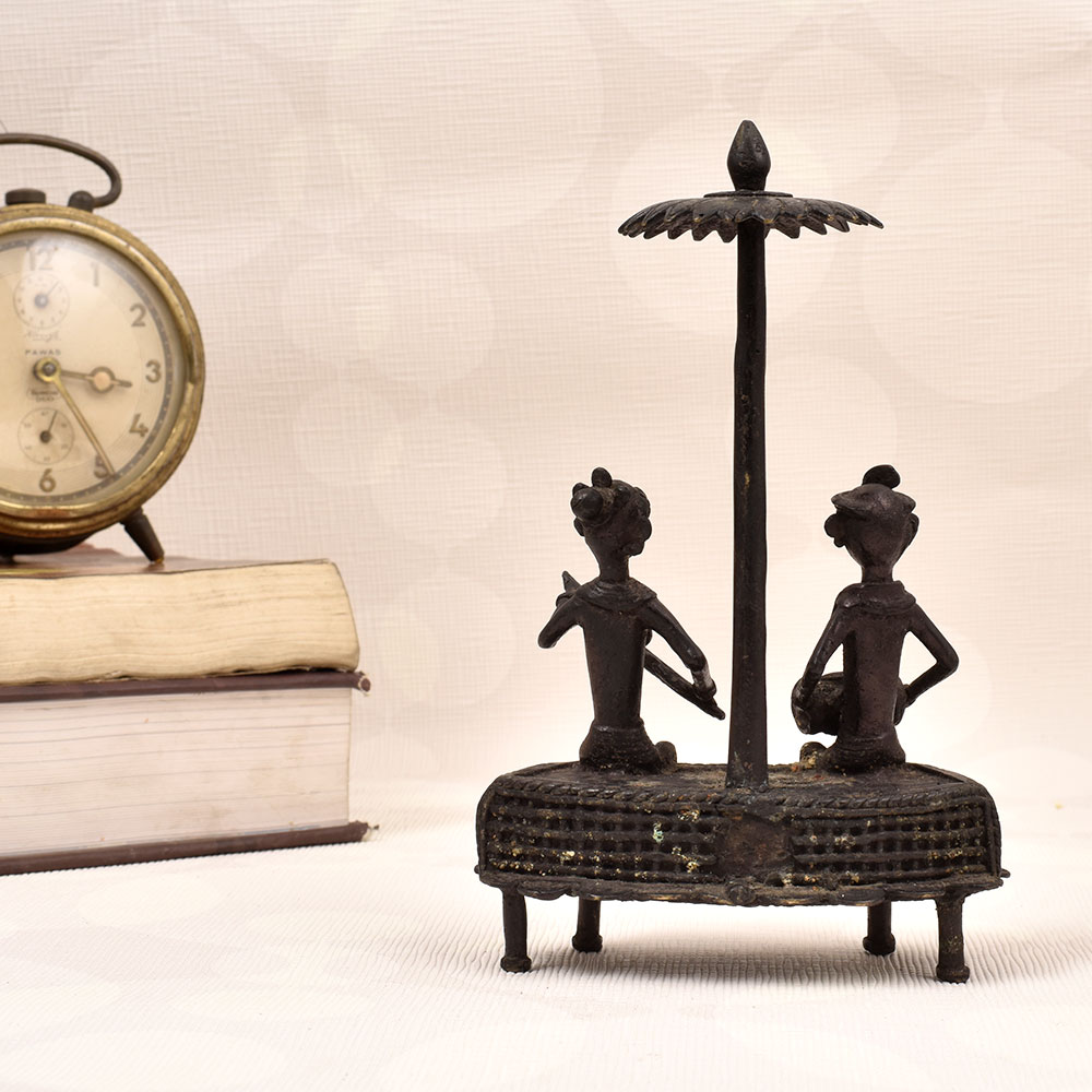 Immerse yourself in the rich cultural heritage of India with this stunning brass statue showcasing the timeless Dhokra art form. Crafted with meticulous attention to detail, this vintage piece features two men masterfully playing traditional musical instruments, exuding a sense of harmony and joy. This Dhokra art brass statue is not just a stunning decoration piece - it's a testament to the rich cultural legacy of India. Dhokra, a non-ferrous metal casting technique dating back thousands of years, is renowned for its unique, organic aesthetic and enduring craftsmanship. Owning this piece allows you to bring a touch of this timeless artistry into your home or office, elevating your space with its captivating presence. Whether you're a collector of fine art, a music aficionado, or simply someone who appreciates the beauty of handcrafted decor, this brass statue is sure to captivate and inspire. Imagine the conversations it will spark, the admiration it will elicit, and the sense of cultural connection it will foster. Elevate your living or workspace with this exquisite Dhokra art piece that celebrates the enduring spirit of Indian craftsmanship.