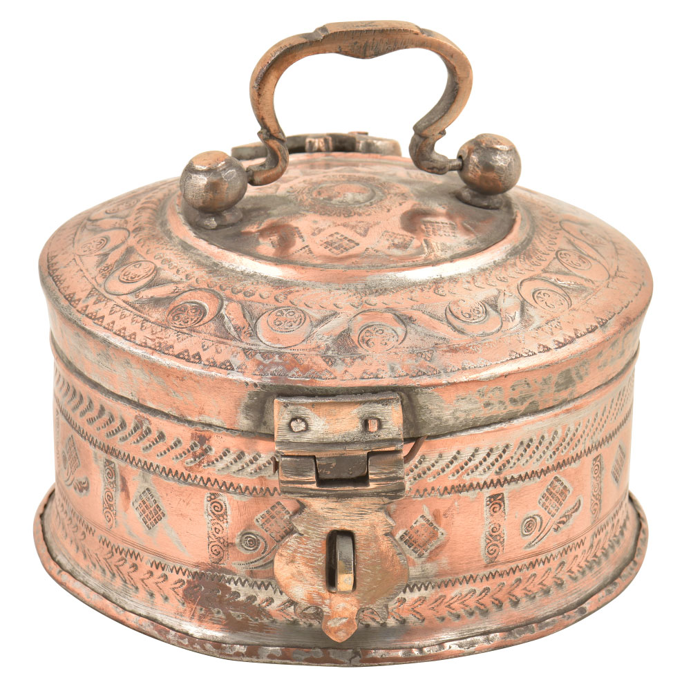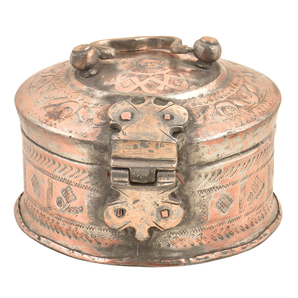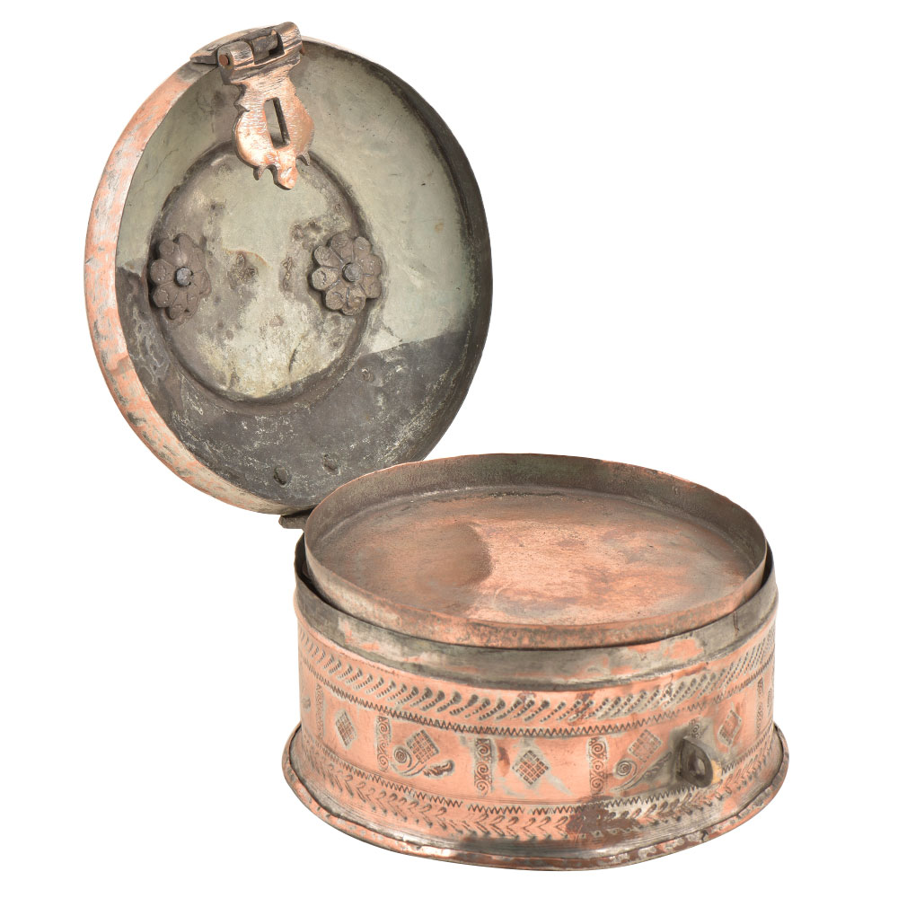 Hand Embossed Copper Betel Nut Pandan Box – with hand hammered floral and incised decoration used to store betel leaf, lime, tobacco and the nut from the areca palm. The practice of chewing betel nut was popular all over Asia and is still a common practice in Myanmar and India. This Pandan betel nut box contains six small pots, each incised on the tops and sides with the same design and metal.