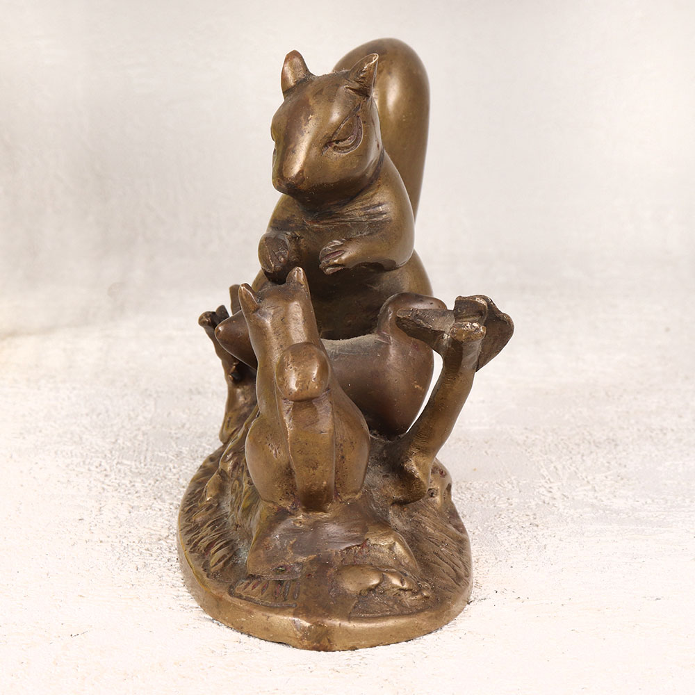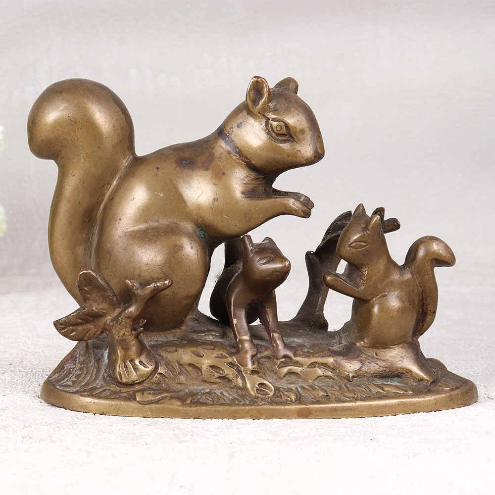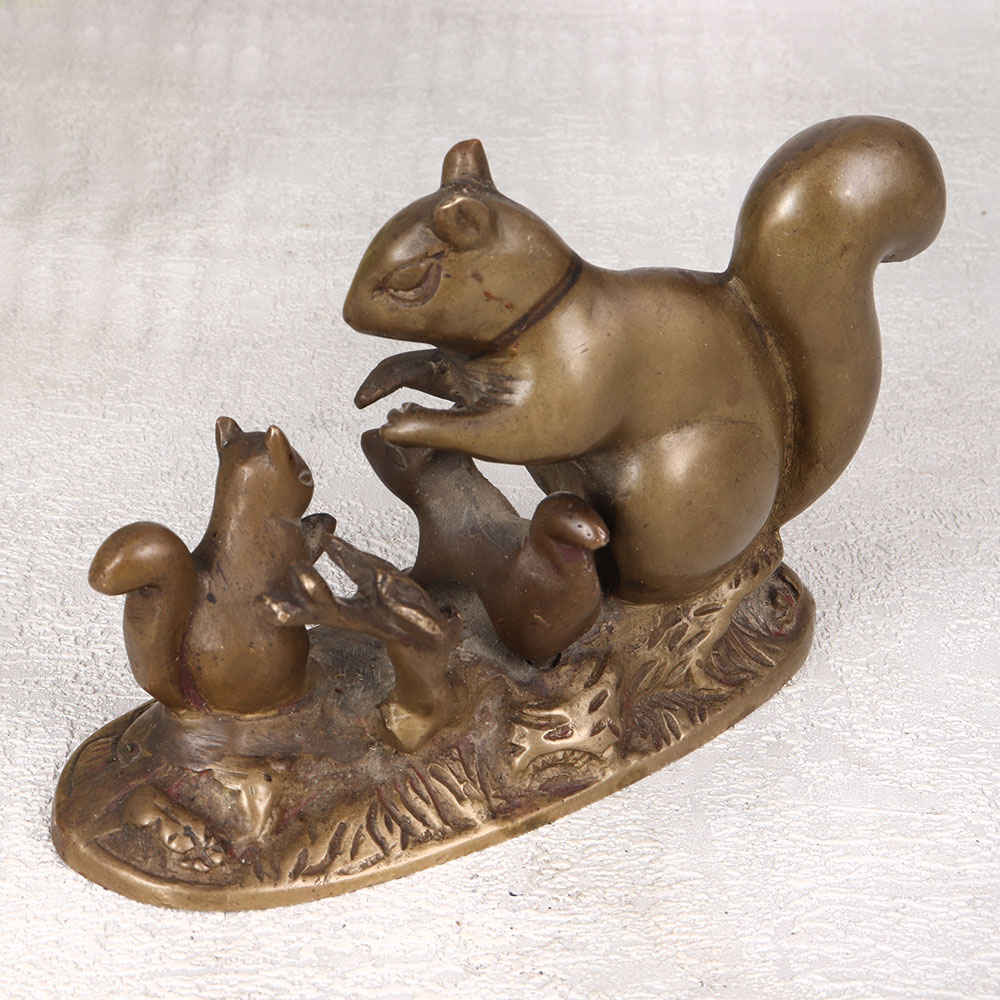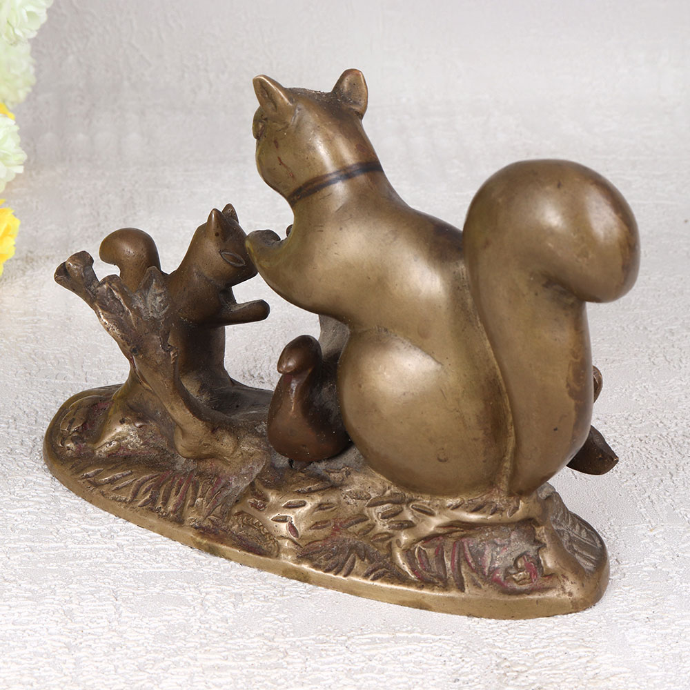 Adorn your living space with the charm of our brass statue depicting a mother squirrel with two adorable babies, crafted with precision by highly talented Indian artisans. This stunning piece is fashioned in the English Art style and showcases the artistry of handcrafted brass, ensuring a unique and timeless appeal. The antique brown finish adds a touch of vintage elegance, making it a perfect addition to any home, office, restaurant, hotel, or cafe. This meticulously crafted statue captures the essence of maternal love and family bonds, making it a meaningful and heart-warming decorative piece. Its versatile design allows it to seamlessly blend into various settings, enhancing the aesthetic of any space. The statue is not just a decorative item but also a collector's delight, offering a touch of sophistication to your vintage collection. Whether celebrating special moments, festivals, or auspicious occasions, this brass statue makes for an exceptional gift. Surprise your family, friends or relatives with a symbol of affection and artistry that transcends time, adding a touch of warmth and beauty to their surroundings.