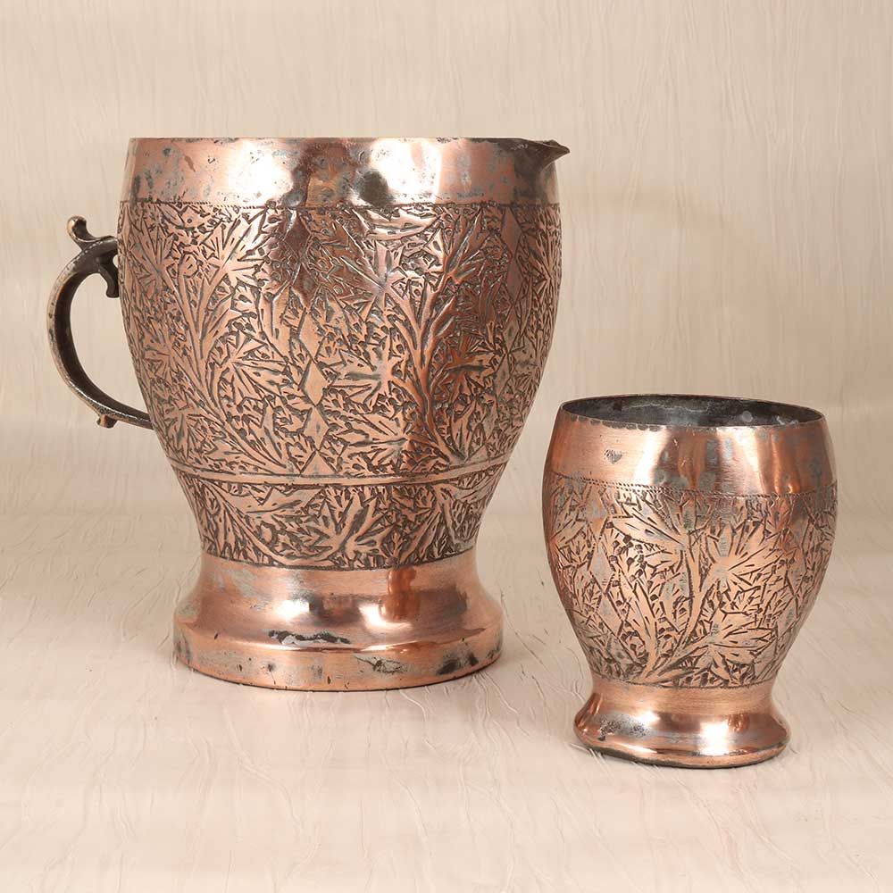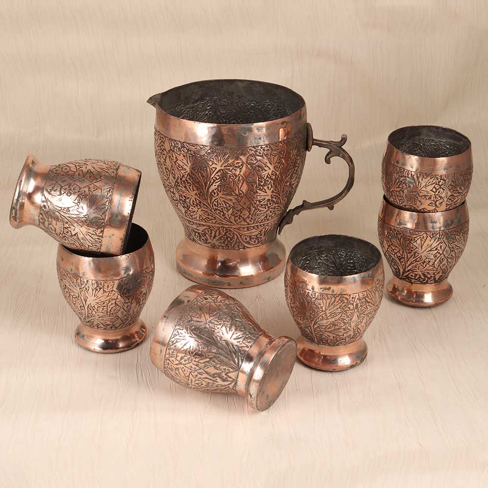 Channel the exotic bazaars of a bygone era with this exquisite vintage copper Jug with six glass set from Kashmir. Lovingly hand-engraved with intricate designs reflecting generations of skilled artistry, this set evokes the richness of Kashmiri heritage. This breathtaking set is a work of art. The jug features remarkable precision etching, with patterns of vines, flowers, and geometric shapes covering its surface. Each of the six glasses flaunts gorgeous cutwork and translucent quality that allows light to dance across the complex motifs. Whether you use it for serving or decorative display, this set is sure to delight all who see it. The vintage styling lends old-world exotic charm, perfect for collectors of folk art and handcrafted treasures from a bygone era. Bring the allure of ancient bazaars into your home with this exquisite hand-engraved copper and glassware. This jug and glass set reflects the outstanding artistry of Kashmiri craftsmanship. Let it transport you on a journey to an enchanting world of beauty and intricacy. A meaningful addition to your home decor.