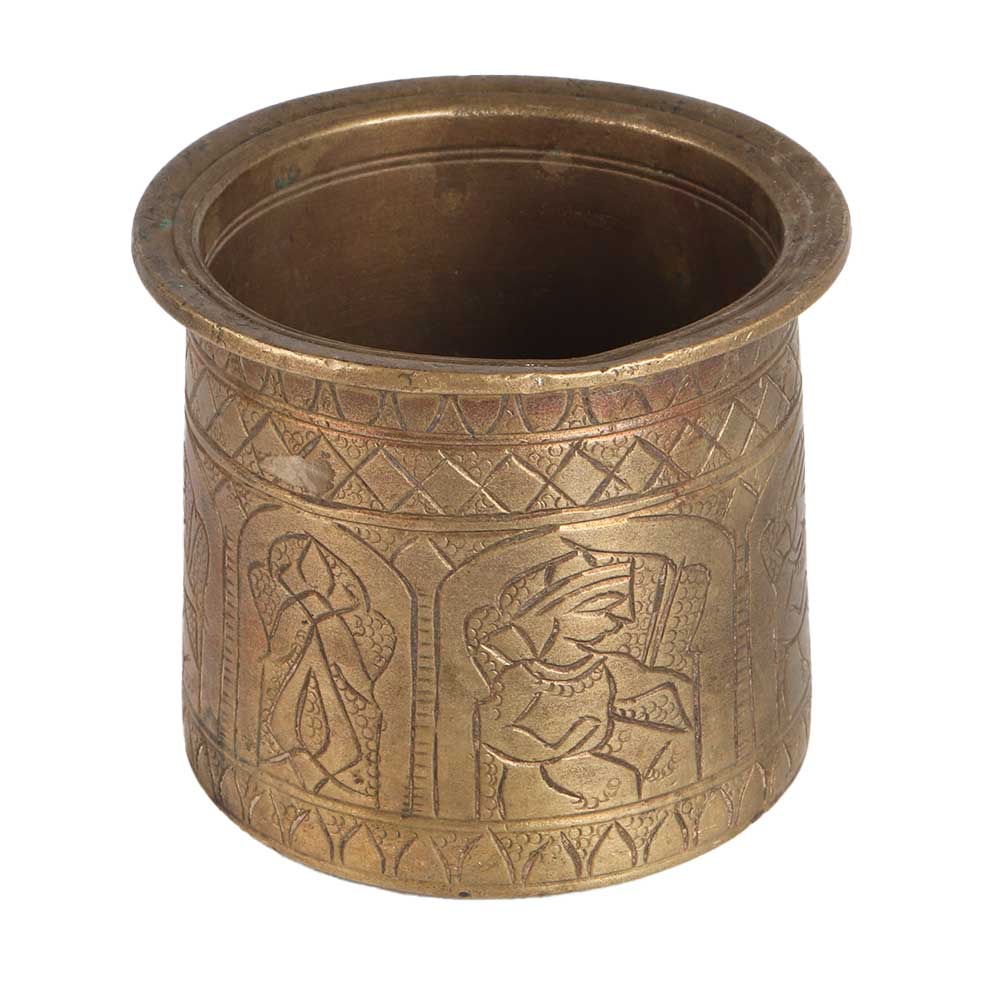 A brass panchpatra which is a beautiful handmade item crafted by skilled artisans from northern India. Made of high-quality brass, this panchpatra is not only sturdy but also has intricate designs that add to its aesthetic appeal. Used for purification of the house with holy water and at temples, this panchpatra is a symbol of the rich cultural heritage of India. Its unique design and beautiful finish make it an excellent item for decoration and vintage collection. This brass panchpatra is a timeless piece that adds sophistication and beauty to any setting while showcasing the artistry of the skilled artisans who created it. It is also a perfect gift for your loved ones on special, festive and auspicious occasion.