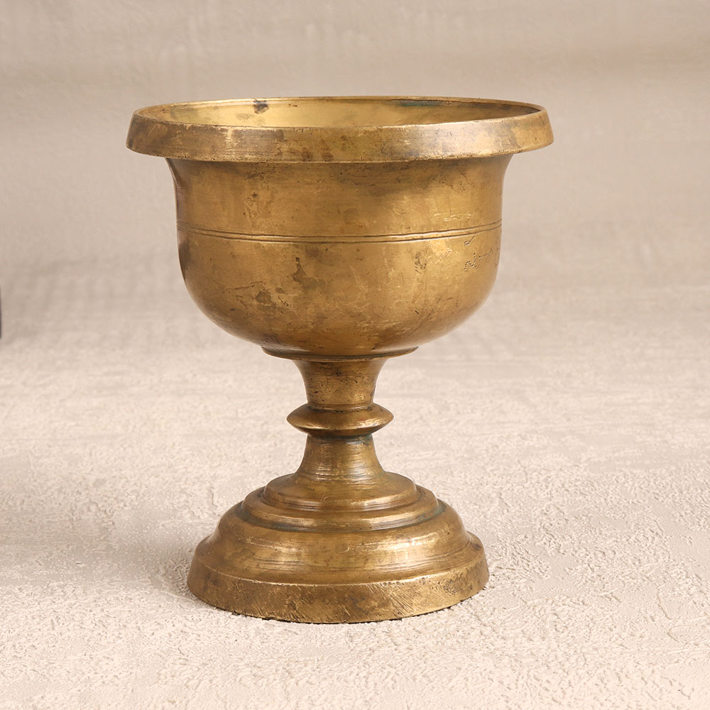 Adorn your living spaces with the timeless elegance of this Vintage Brass Holy Kumkum Bowl Cup. Handcrafted by skilled Indian artisans in the rich tradition of South Indian art, this exquisite piece exudes an aura of spiritual grace and antique charm. Fashioned from high-quality brass, it bears a lustrous antique brown finish that conveys a sense of history and reverence. This bowl cup is a versatile masterpiece, serving as a vessel for holding kumkum, tilak, or bindi during prayers and ceremonies. Its ornate design and intricate detailing make it a piece of art in itself, suitable for display at home, office, restaurant, hotel, or cafe prayer rooms. Moreover, it's a thoughtful gift option for your family, friends or relatives, especially on special, festive, or auspicious occasions, symbolizing blessings and good wishes.