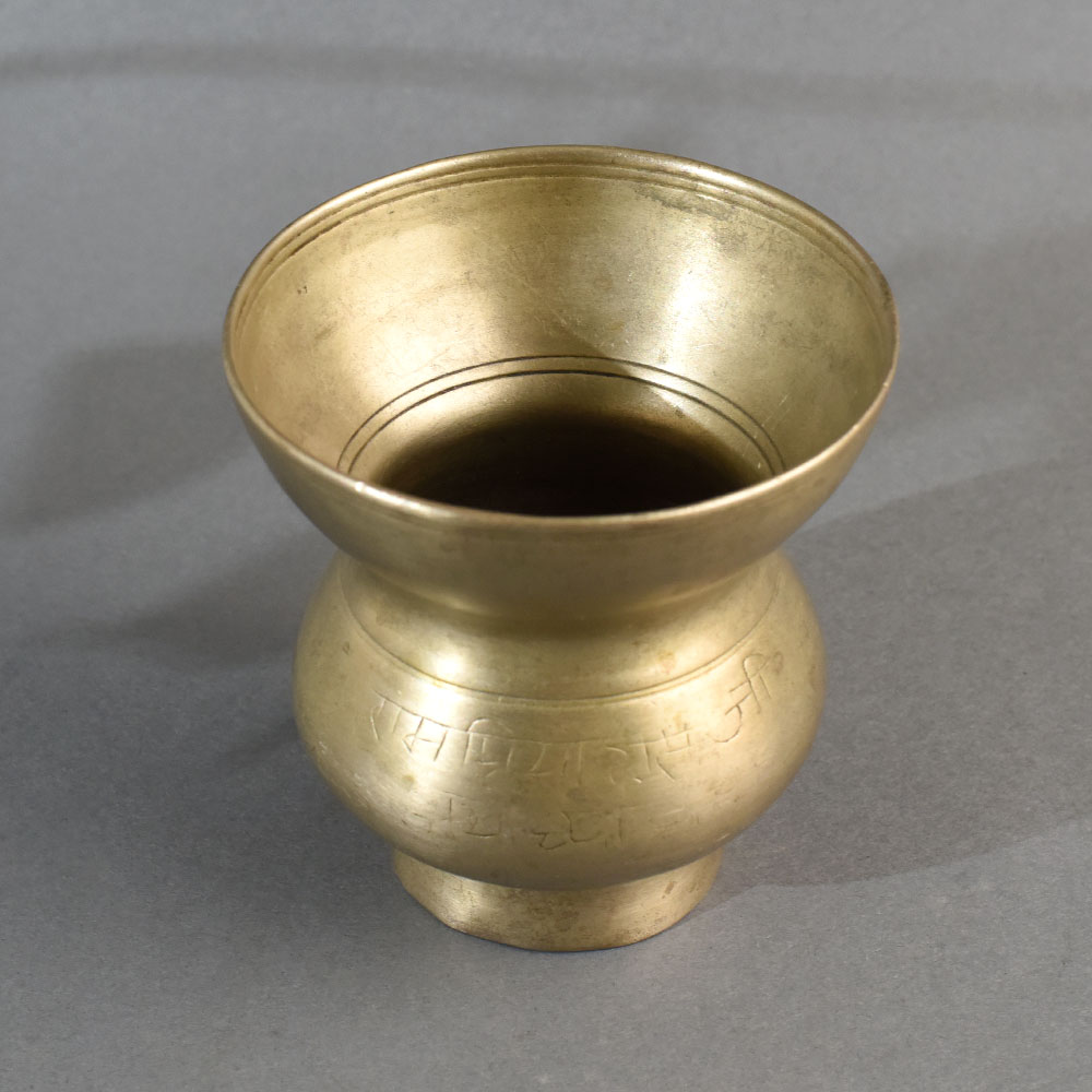 This traditional brass holy water pot is a fine example of South Indian ritual art, commonly used in Hindu religious practices. Crafted from solid brass, it features a gracefully rounded body with a narrow waist and a flared rim, making it both visually appealing and easy to handle during worship. What sets this vessel apart is the hand-inscribed Devanagari script etched around its midsection, adding a layer of spiritual and historical significance. Used to hold Theertham (holy water) or Gangajal, this pot is a vital component of daily puja, abhishekam, and temple offerings. The sturdy base provides excellent balance, while the wide mouth allows for smooth pouring during rituals. The warm, golden tone and naturally aged patina of the brass lend it an antique charm rooted in South Indian tradition.
