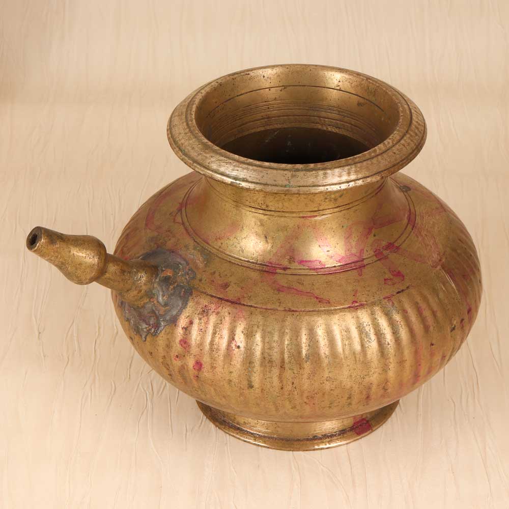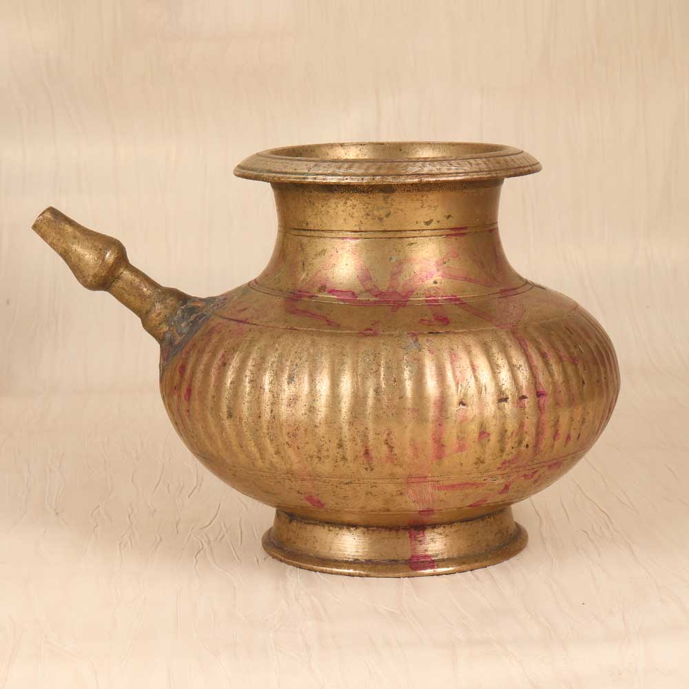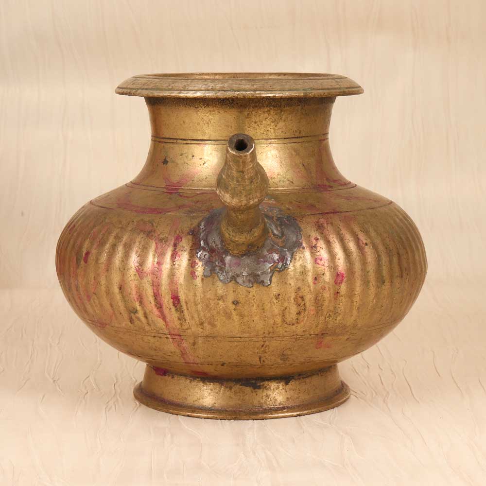 Channel the divine with this vintage handcrafted brass holy water pot. Lovingly shaped in Central India, this pot features a timeworn patina and etched motifs for a relaxed, antique look. A curved spout and sturdy handle allow for easy pouring and display. This beautiful pot brings spiritual tradition to your home decor. Place it prominently on your altar or side table to complement your vintage-inspired space. The aged brass and floral etchings give this pot an antiqued look, like you discovered it in a charming antique store. Give the gift of faith and history with this handcrafted pot. Perfect for the traditional religious person in your life who will appreciate its artisanal quality and timeless design. Whether displayed in the home or used to store holy water, this pot connects people to their spiritual roots in a classic, meaningful way.