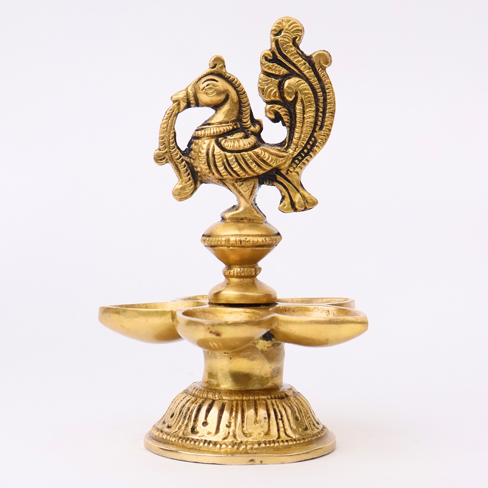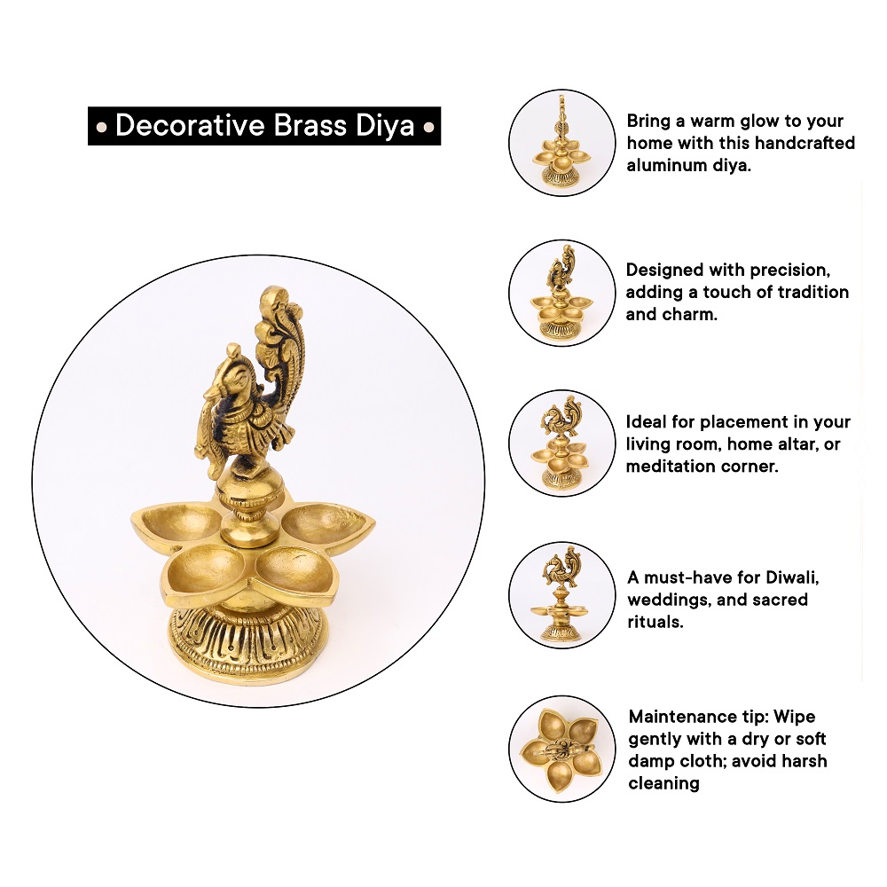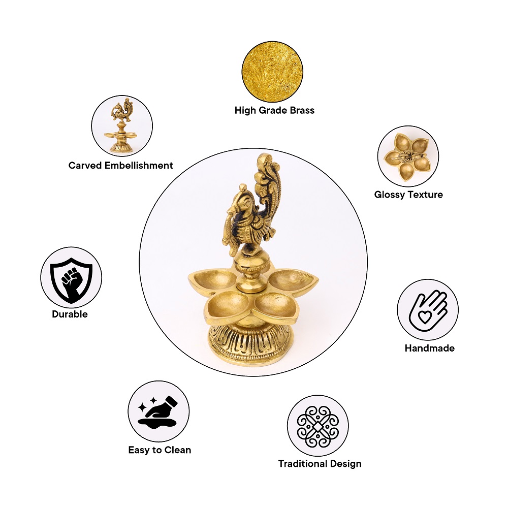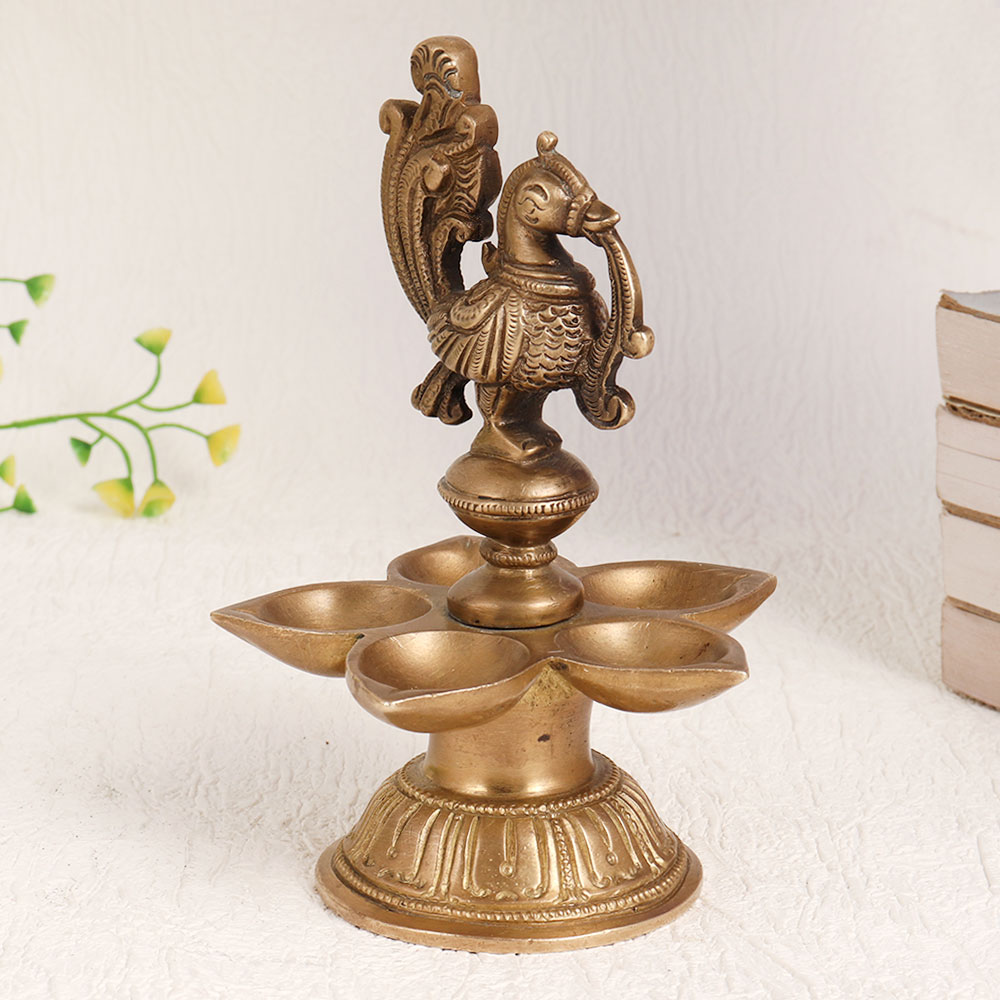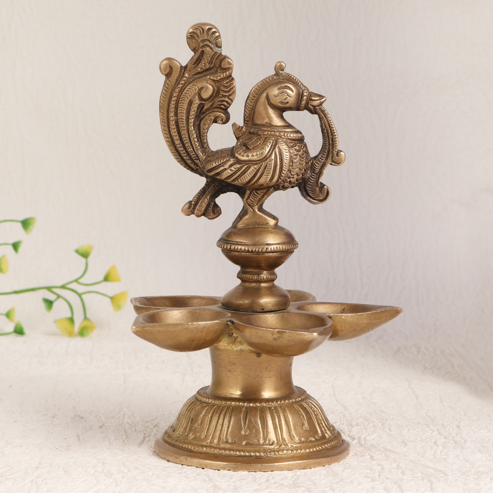 Enhance the ambiance of your space with the exquisite Brass Peacock Oil Lamp. Crafted by highly skilled and experienced Indian artisans, this masterpiece is a testament to their craftsmanship and attention to detail. This splendid oil lamp boasts a stunning antique brown finish that adds a touch of vintage charm to any setting. Its intricate design features a majestic peacock, a symbol of grace and beauty in Indian culture, making it a captivating decorative piece. Equipped with five jyots, you can illuminate them simultaneously using mustard oil or desi ghee with cotton wicks. The soft, flickering glow creates a warm and inviting atmosphere, perfect for enhancing the aesthetics of your home, office, restaurant, hotel, cafe, or shop. Whether you're an avid collector of vintage items or wish to exhibit it at special events, this lamp is a conversation starter. Additionally, it makes a thoughtful and memorable gift for your loved ones during special, festive, or auspicious occasions.